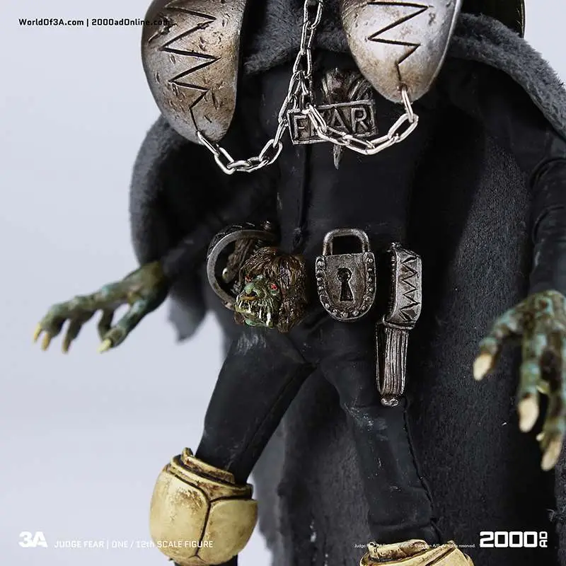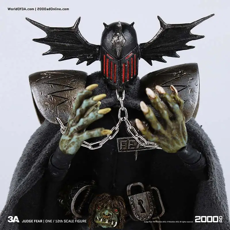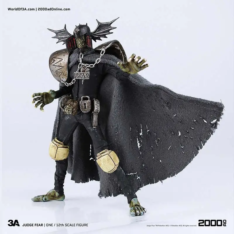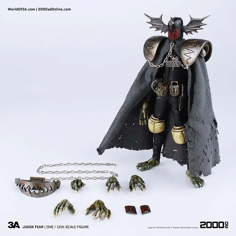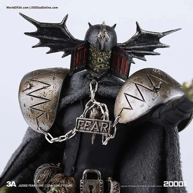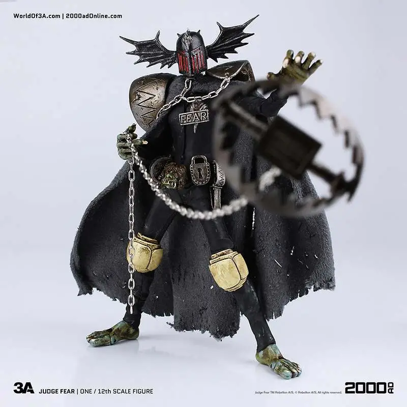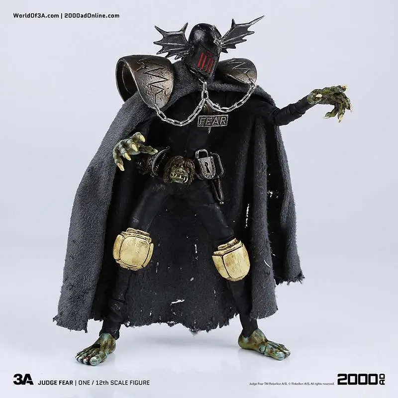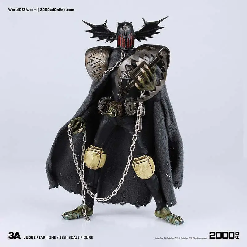 Gaze into the face of Fear! The grotesque and imposing Dark Judge hellbent on terrifying all life to death as he passes his judgement! ThreeA�'s 1/12th Scale Collectible Series Edition brings the haunting visage to life with an incredibly detailed and fully articulated sculpt, gorgeous paint applications, and intricately tailored fabric outfit including real metal chains.