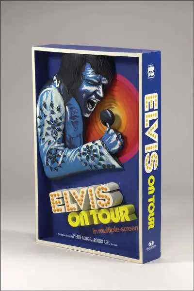 Measures 8 inches wide by 12 inches high by 2 inches deep. Includes light-up feature: colored circles around microphone and "ELVIS" name both illuminate. Can be wall-mounted or stand on any flat surface.