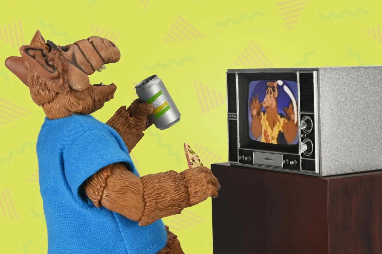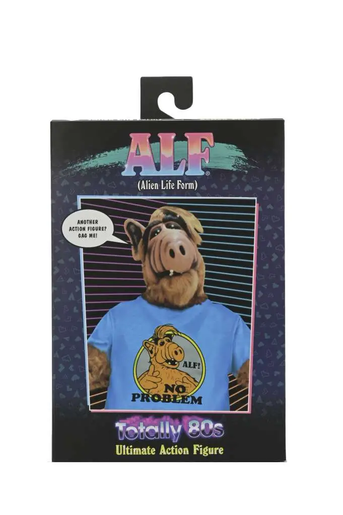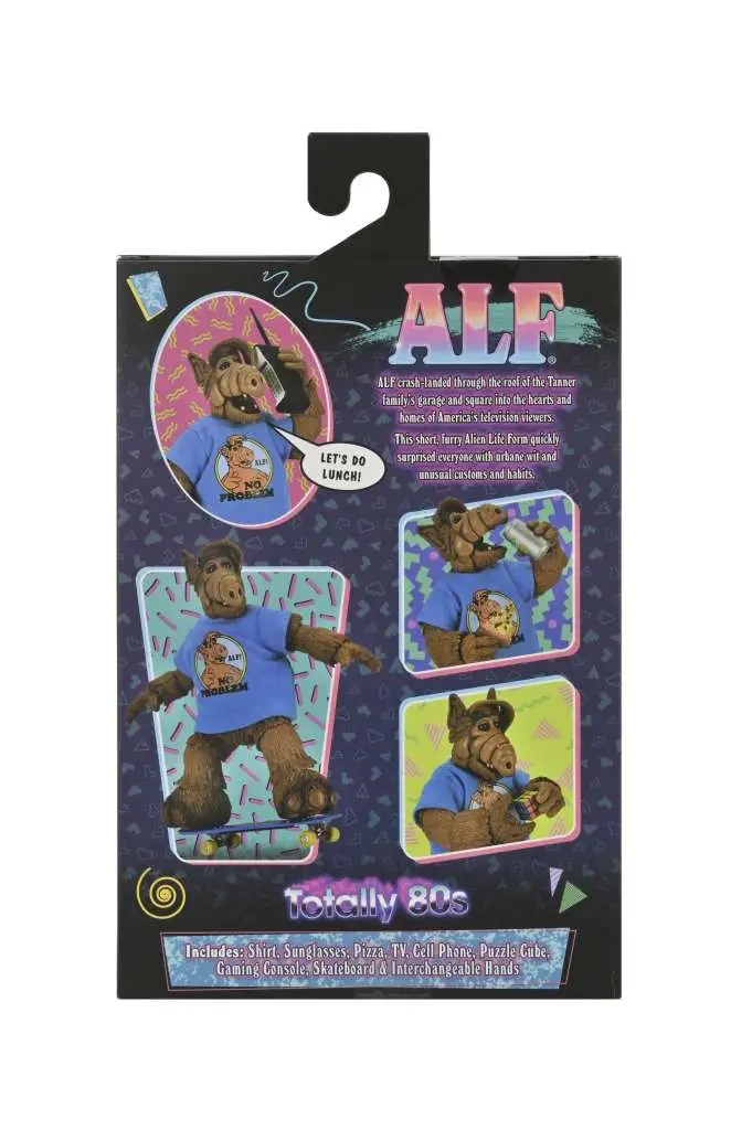 Bring home your own Alien Life Form with this Ultimate action figure ALF, everyone’s favorite visitor from the planet Melmac! The 80s sitcom about a cranky alien hiding in a local family’s garage after crash-landing on our planet hit all the right notes with a generation, and now the “Totally 80s” ALF steps into the spotlight as a 7” scale Ultimate action figure. Includes Interchangeable heads and hands, puzzle cube, sunglasses, mobile phone, video game console with controller, television, soda can, skateboard, and slices of pizza with pizza box! Collector-friendly window box packaging with opening front flap.