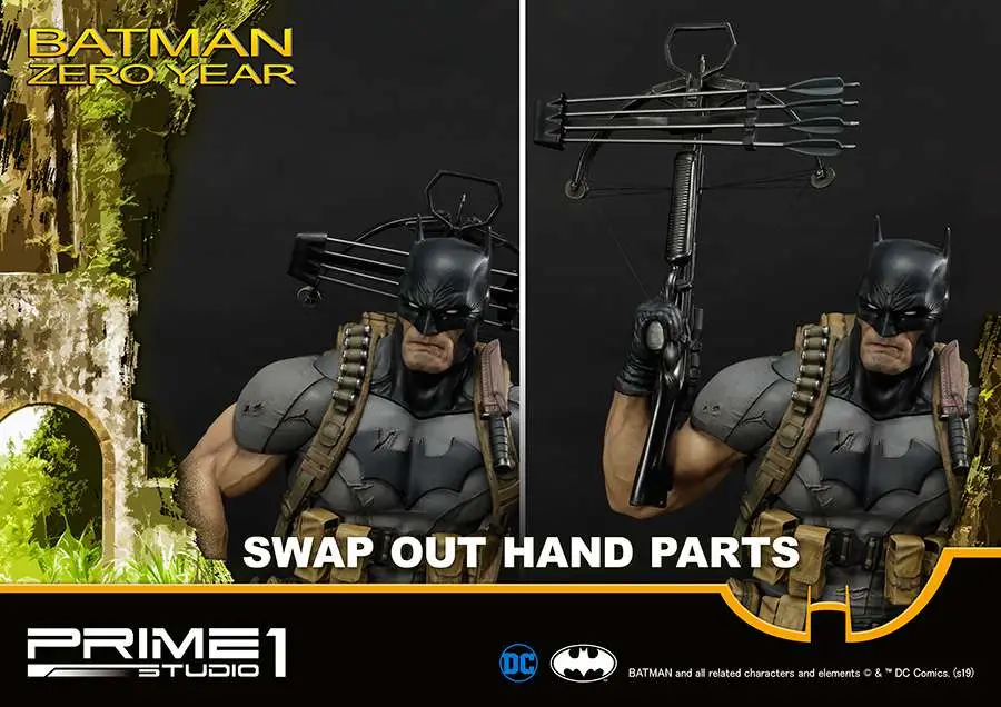 This Ultimate Museum Masterline Batman Zero Year statue riding on his bike (standing on a designed theme base) comes with an extra interchangeable right-arm holding the Crossbow.