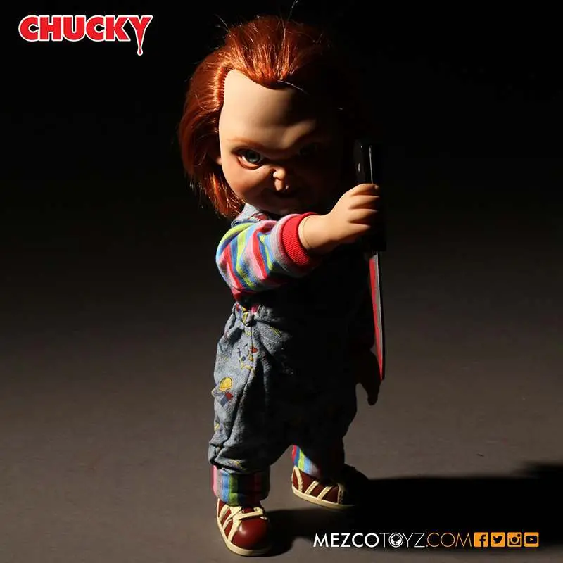 The star of the CHILD'S PLAY films, Chucky stands fifteen inches tall and features real cloth Good Guys clothing, eleven points of articulation, his trademark orange hair and realistic glass-like eyes. Each Chucky comes packaged in his own collector-friendly window box based on the original box design seen in the films.