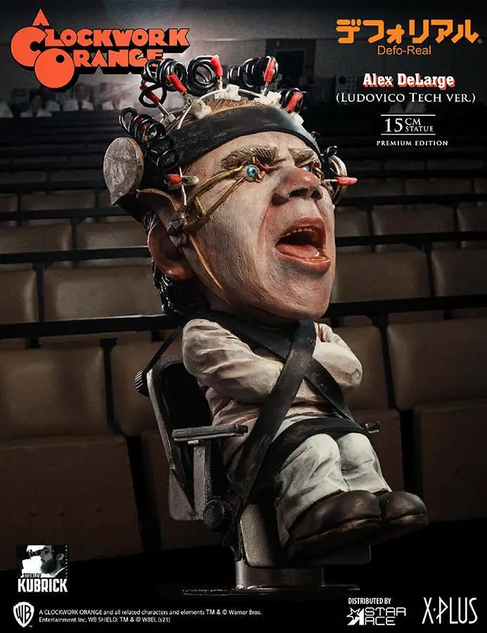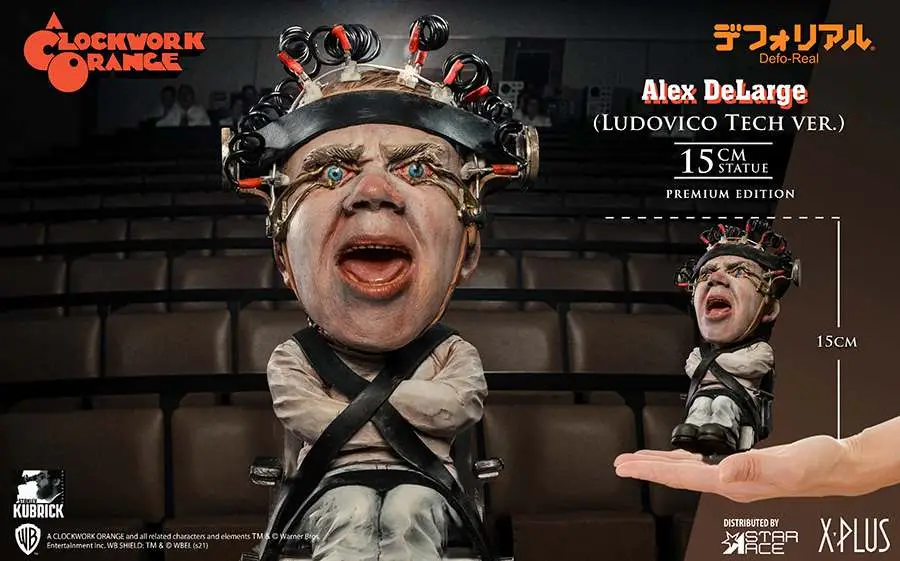 Star Ace continues its salute to the Stanley Kubrick classic, A Clockwork Orange with another Defo Real of juvenile delinquent Alex Delarge. This statue features Alex undergoing the tortuous “Ludovico Technique” to “cure” him of his violent tendencies. In this highly detailed sculpture Alex is strapped to a chair with his eyelids pinned back. He screams in agony as his beautiful Ludwig Van plays while he’s forced to watch scenes of ultra-violence. Hand sculpted by the artisans at Kaibutsuya Shop, each mini-statue is painted by skilled artisans.