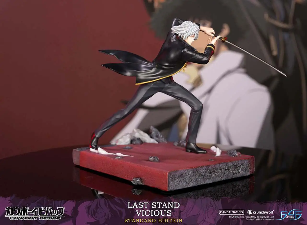 First 4 Figures proudly presents Vicious from the hit classic anime Cowboy Bebop as he appeared in his Last Stand against the legendary bounty hunter, Spike Spiegel! Vicious is faithfully recreated in his black suit with golden accents. The smallest details are included, from the intricate features of Vicious’s katana to the flow of his coat and hair. The statue’s base is designed after the Red Dragon Crime Syndicate’s headquarters where Vicious faces off against Spike for the final time!