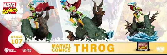 Released under the D-Stage line from Beast Kingdom, the ‘Throg’ Diorama is a fun and humorous recreation of the mini Frog-Thor in the midst of a battle with a large crocodile! Sporting his signature cape, costume and mighty Mjolnir hammer, only in tiny form and worn by a frog, the battle itself looks anything but mini. Epic in scope with waves splashing amongst the dense forest trees and carefully recreated in three dimensional form, this is a diorama fit for any Throg fan!