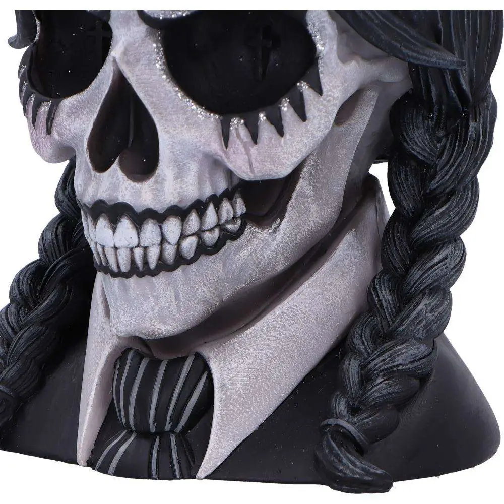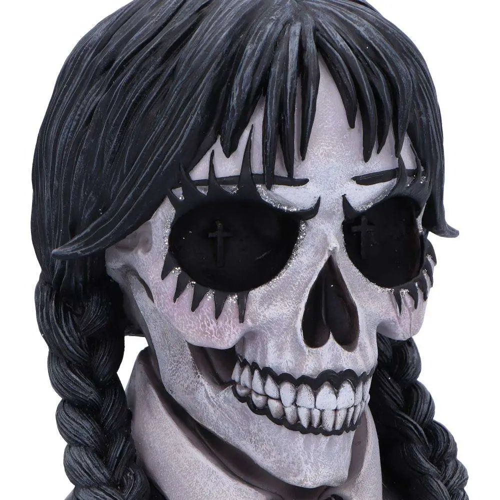 Dark Glare is a gothic school girl-inspired skull, masterfully designed by Nemesis Now. This hauntingly beautiful piece is cast in the finest resin, showcasing intricate details that blend dark, eerie aesthetics with the innocence of a school uniform. The skull is hand-painted and adorned with black and white attire, while plaited black hair cascades down, adding a touch of gothic charm. Glitter accents around the eyes offer a captivating contrast, creating a mesmerizing, otherworldly gaze.