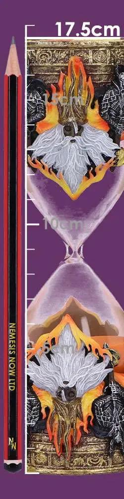 Intricately designed sand timer with fire-themed detailing and aged metallic finishes.