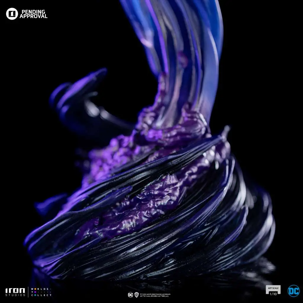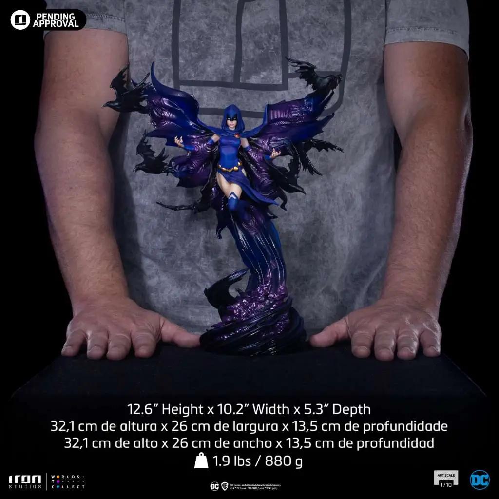 Above a vortex of dark purple energy made of condensed spirits from another dimension, the titan hero fuses her body to the energy, which takes the shape of a long cape connected to her body and opening like big wings, from which black ravens appear flying, like spells cast by her with open arms. Bringing an extra interchangeable head, without the hood, totally revealing her beautiful face, but with her stern and ominous countenance, chosen by fans and collectors, Iron Studios bring the statue "Raven - DC Comics series #8 - Art Scale 1/10", the mystic and powerful half-human/half-demon hero, founding member of the group of heroes known as the New Teen Titans.