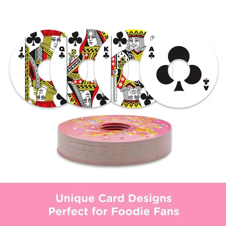 This Donut Shaped deck of standard playing cards includes 54 cards (52 playing cards and 2 jokers) like you could find in a casino. Every single playing card features its own distinct Donut themed design and art