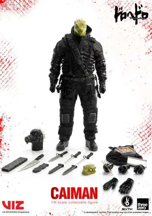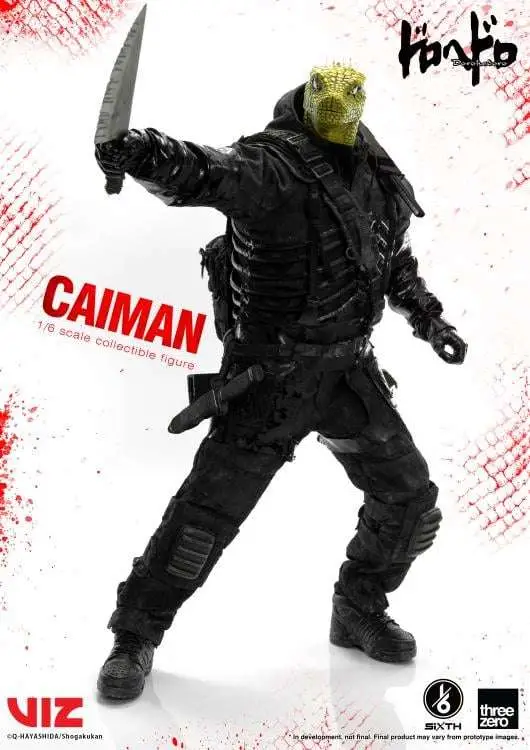 1/6 Caiman is a fully-articulated figure with approximately 30 points of articulation. It stands approximately 36cm (12.9") tall, replicating the character in 1/6th scale, who measures over 210cm (6.8') tall in the story. The primary materials used for the figure are PVC, ABS, POM and fabric. The costuming features detailed paint techniques replicating dust and sludge-like weathering effects.