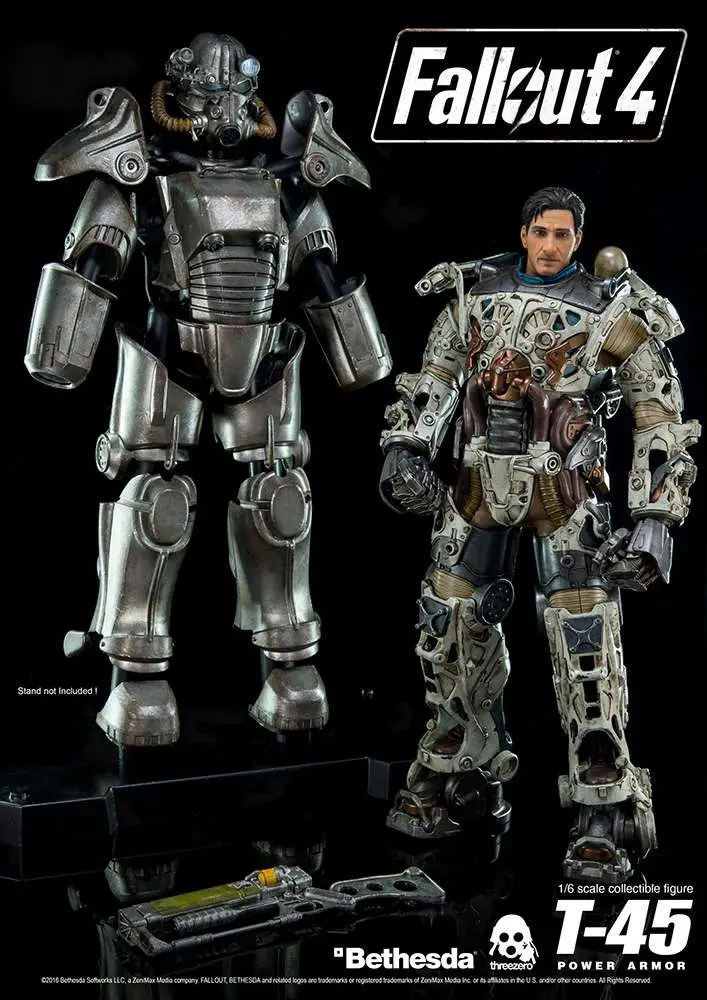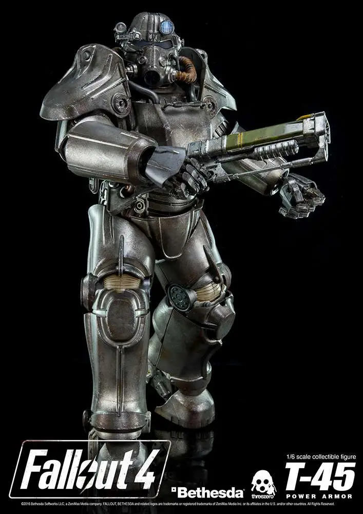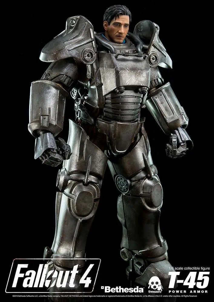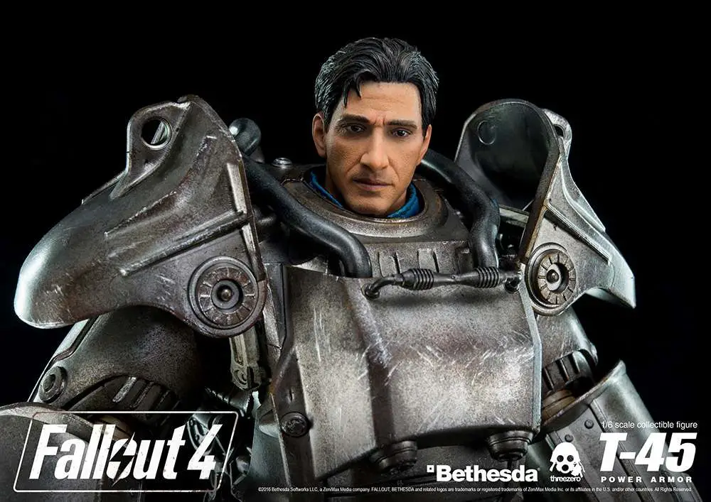 Threezero is glad to announce the T-45 Fallout 4 Collectible Figure. The T-45 stands approximately 14.5 inches tall with incredible details and over 35 articulated parts. Featuring an interchangeable male head and helmet that includes LED light-up functions. All outer-armor pieces are detachable and weathered with incredible paint application based on the appearance in the video game.