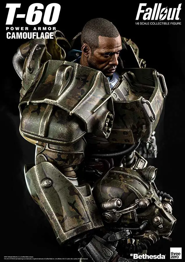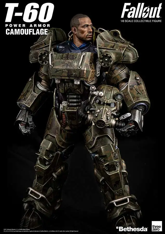Fallout – 1/6 Tâ€60 Camouflage Power Armor is a fully-articulated collectible figure, its pieces are completely interchangeable with all previous threezero 1/6 Fallout figures.