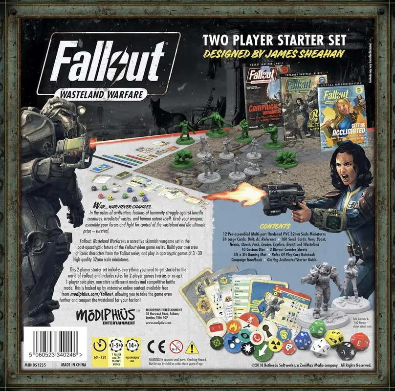 This Fallout: Wasteland Warfare two player starter set contains 32mm scale high-quality hardened multi-part pre-assembled PVC miniatures with scenic bases.