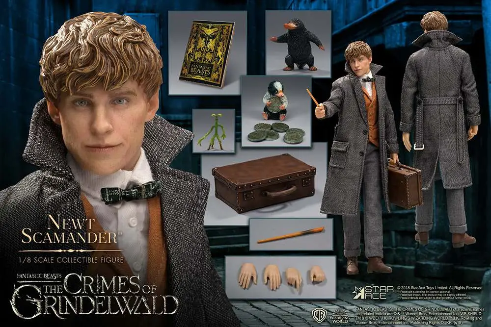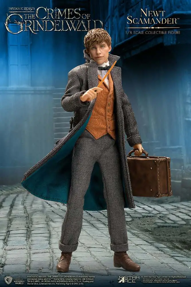 This 1/8th scale figure features an authentic likeness of Newt as portrayed by Eddie Redmayne and features an authentic period costume, his special case, wand, book, bowtruckle, niffler and a baby niffler.