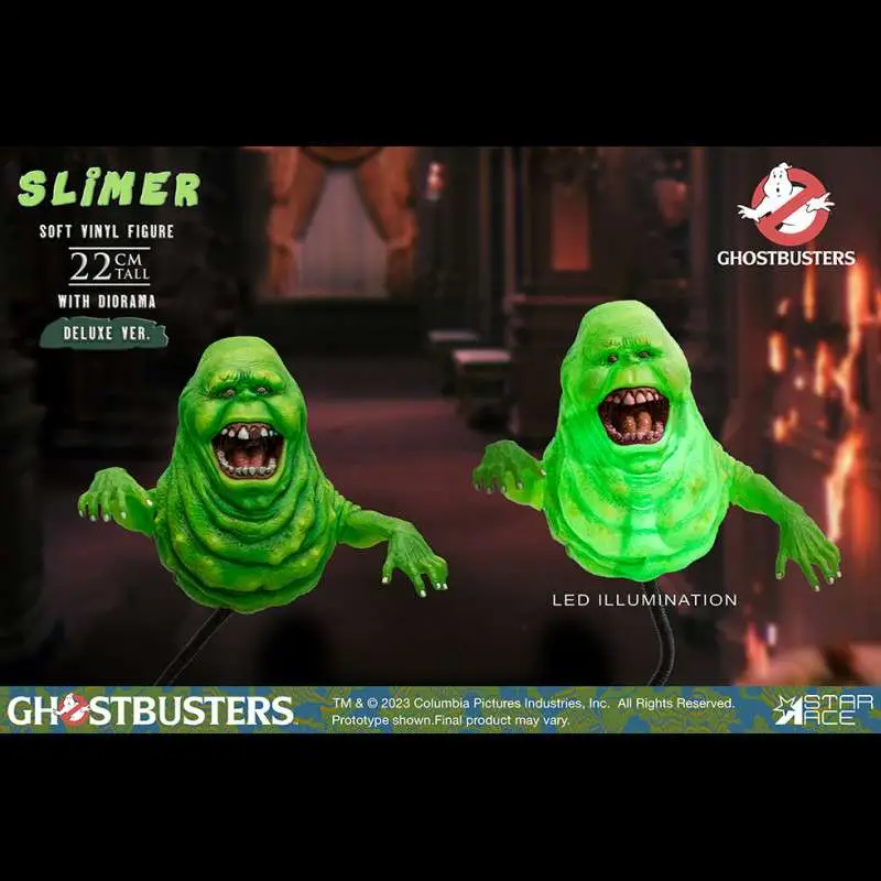 The deluxe version of Slimer is cast in transparent slime green and has LED lights inside to add to his ghostly glow. The deluxe also has him chowing down on stolen hotdogs. The deluxe display base features the Ghostbusters logo and the spillover from his huge appetite, giving you the perfect setting to showcase this lovable yet mischievous character in all its green, ectoplasmic glory.
