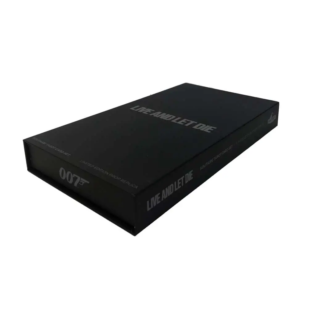 Each card is printed on heavyweight playing card-stock and features a stylized 007 motif pattern on the reverse. Presented in a stylish gift box, with a magnetic closure. Each set includes an individually numbered COA booklet and a screen-accurate black velvet storage bag.