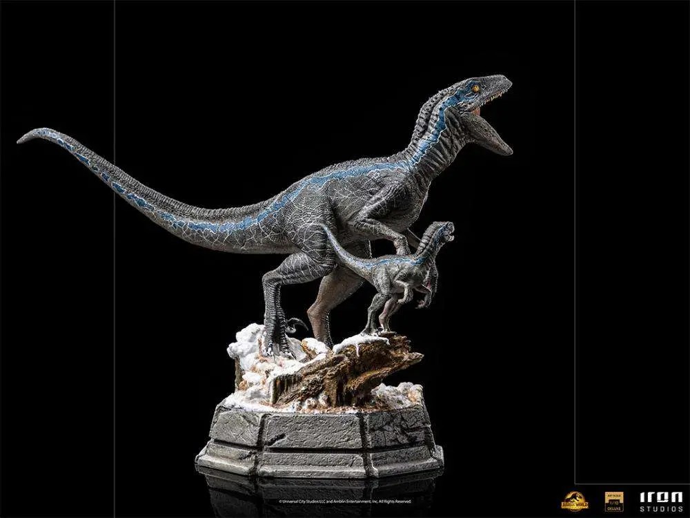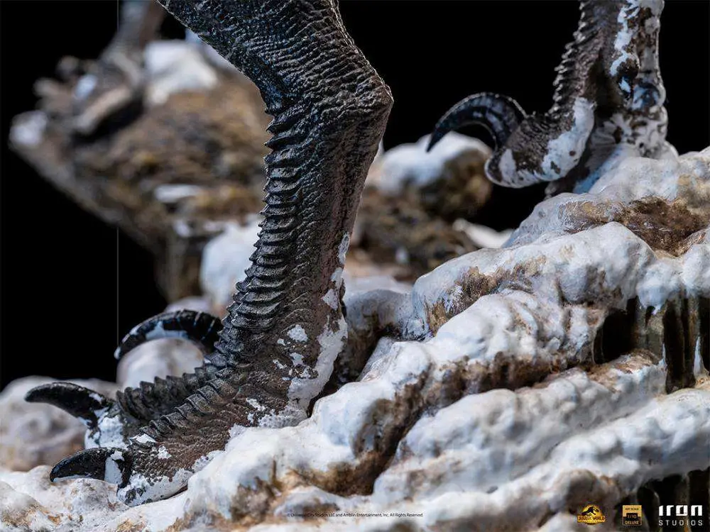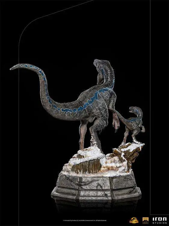 The only survivor from her pack, the female Velociraptor with blue-gray skin, marked with a characteristic blue strip that determined her name, finds new company next to her, her offspring, a younger and smaller version of herself. Discovering a new world, and adapting to a new wild terrain with lower temperatures, the small baby predator watches her mother closely while she roars over a pedestal of dirt and trunks covered by snow. With the movie’s logo on the front, sculpted in a stone mural that circles the pedestal, Iron Studios proudly present another release derivative from the Jurassic World trilogy’s awaited climax, with the deluxe statue of Blue and Beta, the Velociraptor most beloved by fans and her small baby.