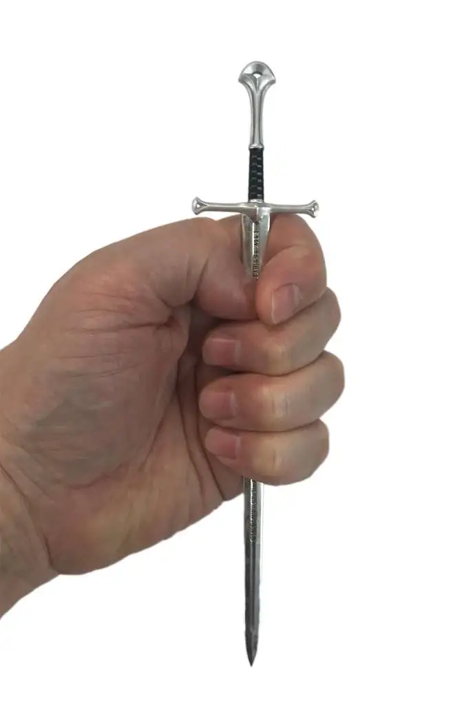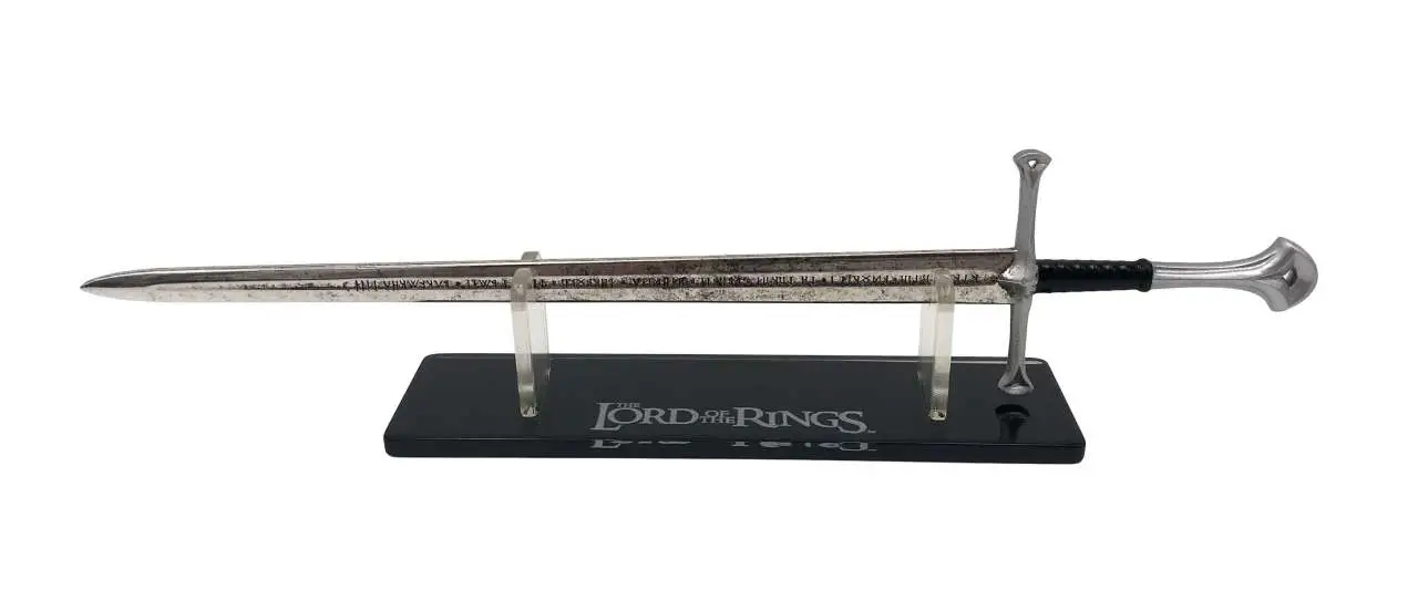 A high quality, officially licensed scaled prop replica of Andúril, also called The Flame of the West. A sword reforged from the shards of Narsil, the sword of Elendil, which Isildur used to defeat Sauron during the Second Age. Wielded by Aragorn in the Lord of the Rings trilogy. "Nányë Andúril I né Narsil i macil Elendilo. Lercuvantan i móli Mordórëo"