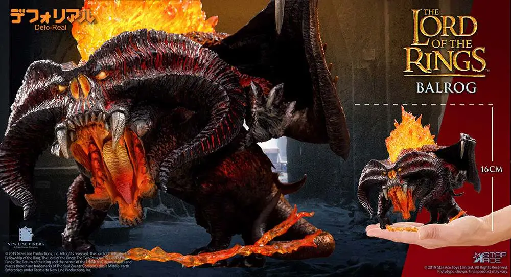 The Defo-Real series, from Star Ace, ventures into The Adventures of Middle Earth. The Balrog dwells beneath the earth, one of Sauron’s evil servants from a forgotten age. In The Lord of the Rings: Fellowship of the Ring, the wizard Gandalf faces the Balrog to protect the fellowship from certain doom.  The Defo-Real Balrog stands just about 6 inches tall and features a stylized sculpt with an oversized head.