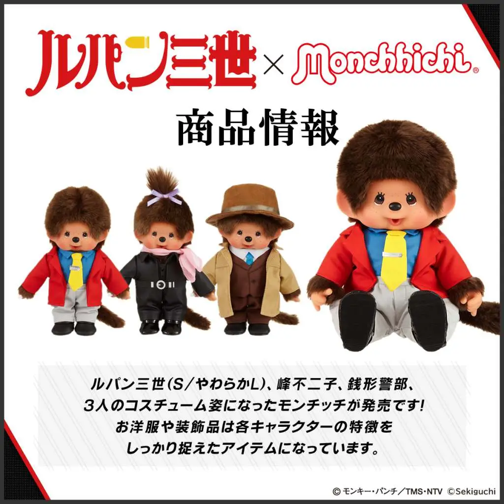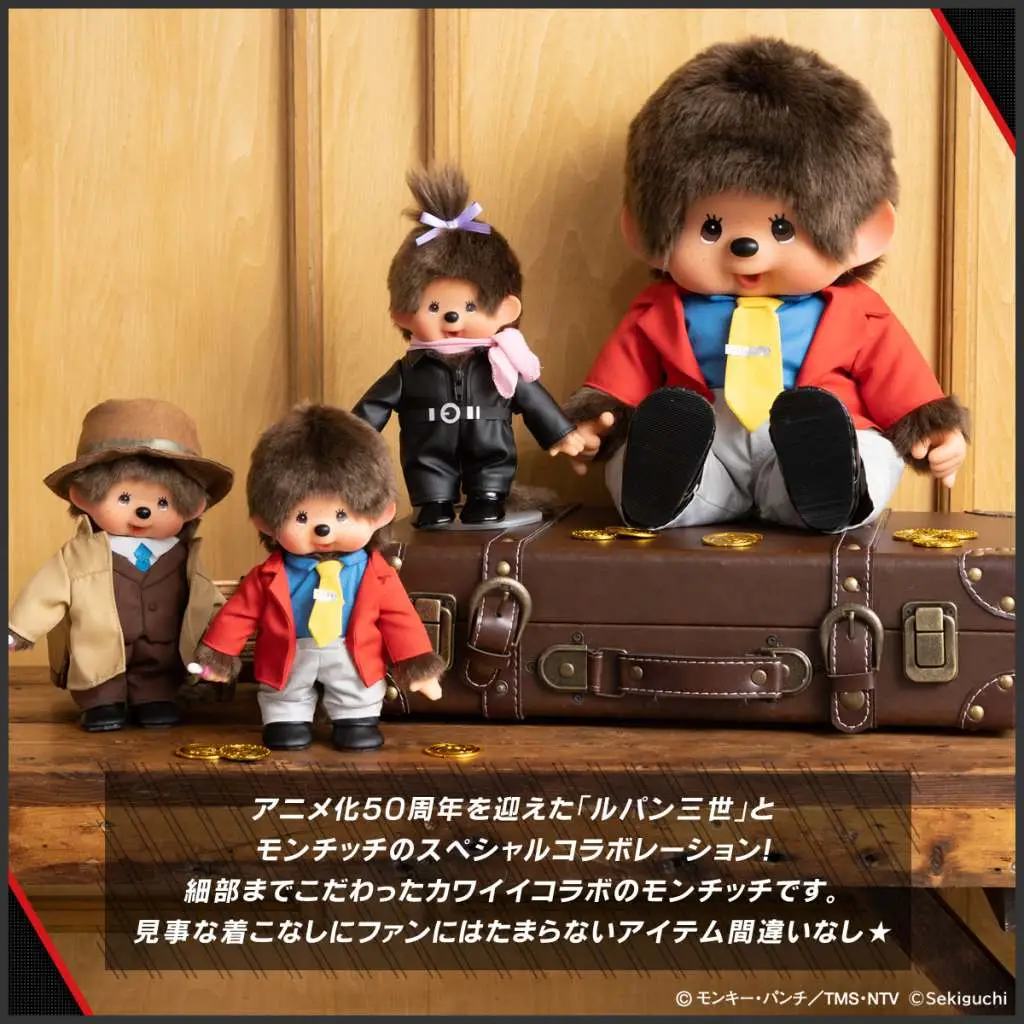 Call them Monchhichis, Chicaboo, Mon Ciccì, Kikki or Virkiki, the adorable monkeys designed by Koichi Sekiguchi have been among the best-selling plushes in the world since 1975. We offer them in a mash-up with the most loved thief in the world, Lupin the third, in a line of plush all to collect.