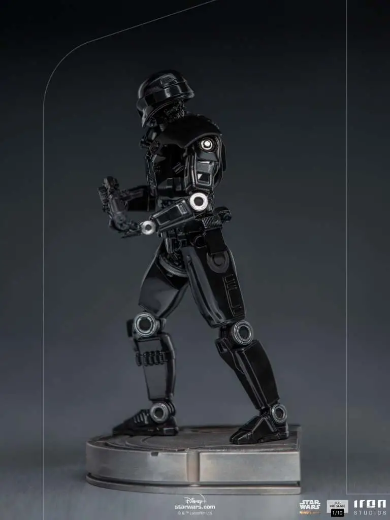A figure covered in shining black armor is aboard Imperial Officer Moff Gideon's space cruiser, directing his red photoreceptor eyes towards his objective, wielding a large blaster rifle and ready to fire with precision at any target. Iron Studios thus presents its statue of the fearsome "Dark Trooper BDS Art Scale 1/10 - The Mandalorian - Iron Studios", one of the most efficient and powerful Imperial combat droids. Just as seen in the second season of The Mandalorian series, a spin-off from Star Wars on the Disney+ streaming channel.