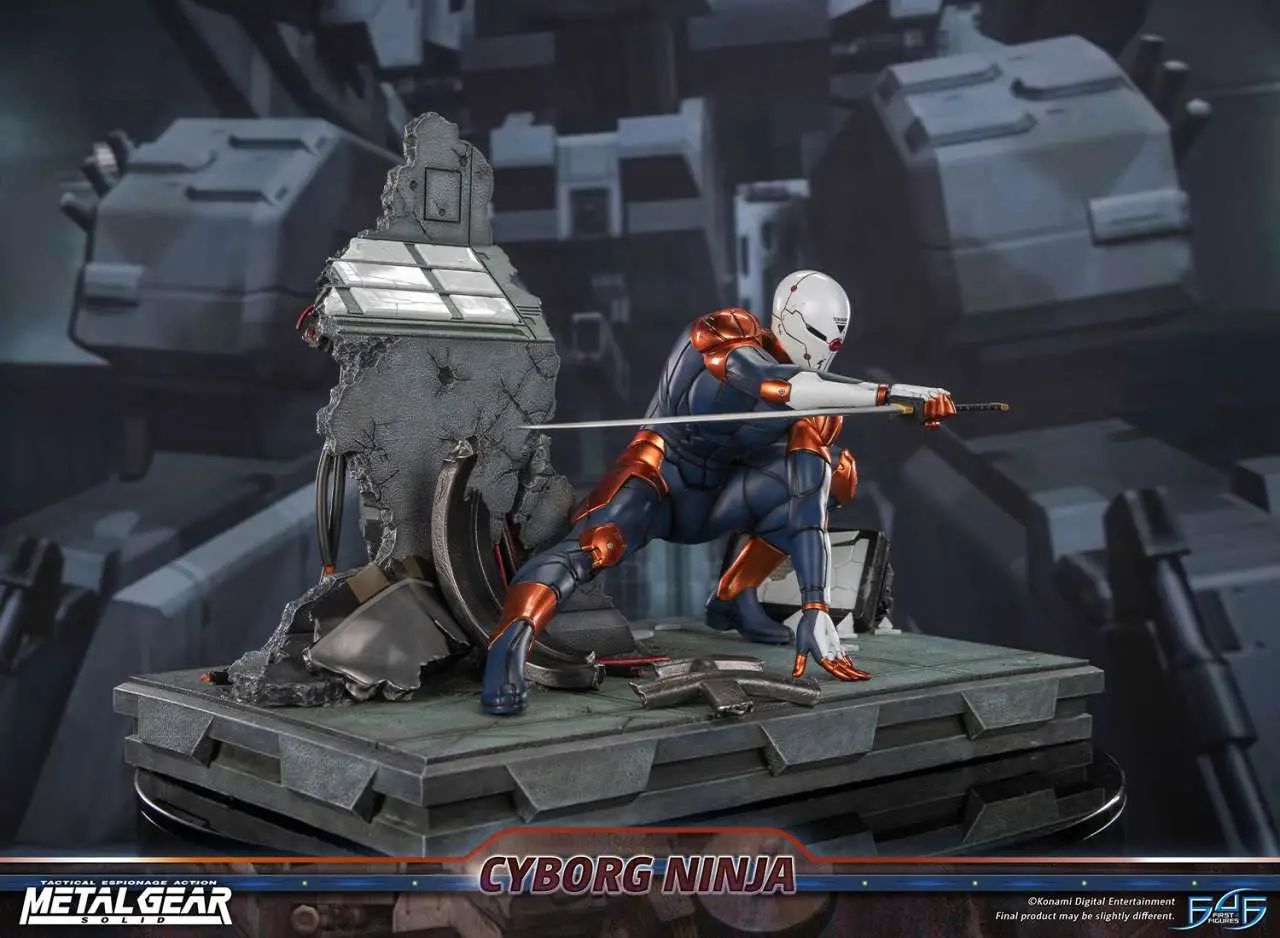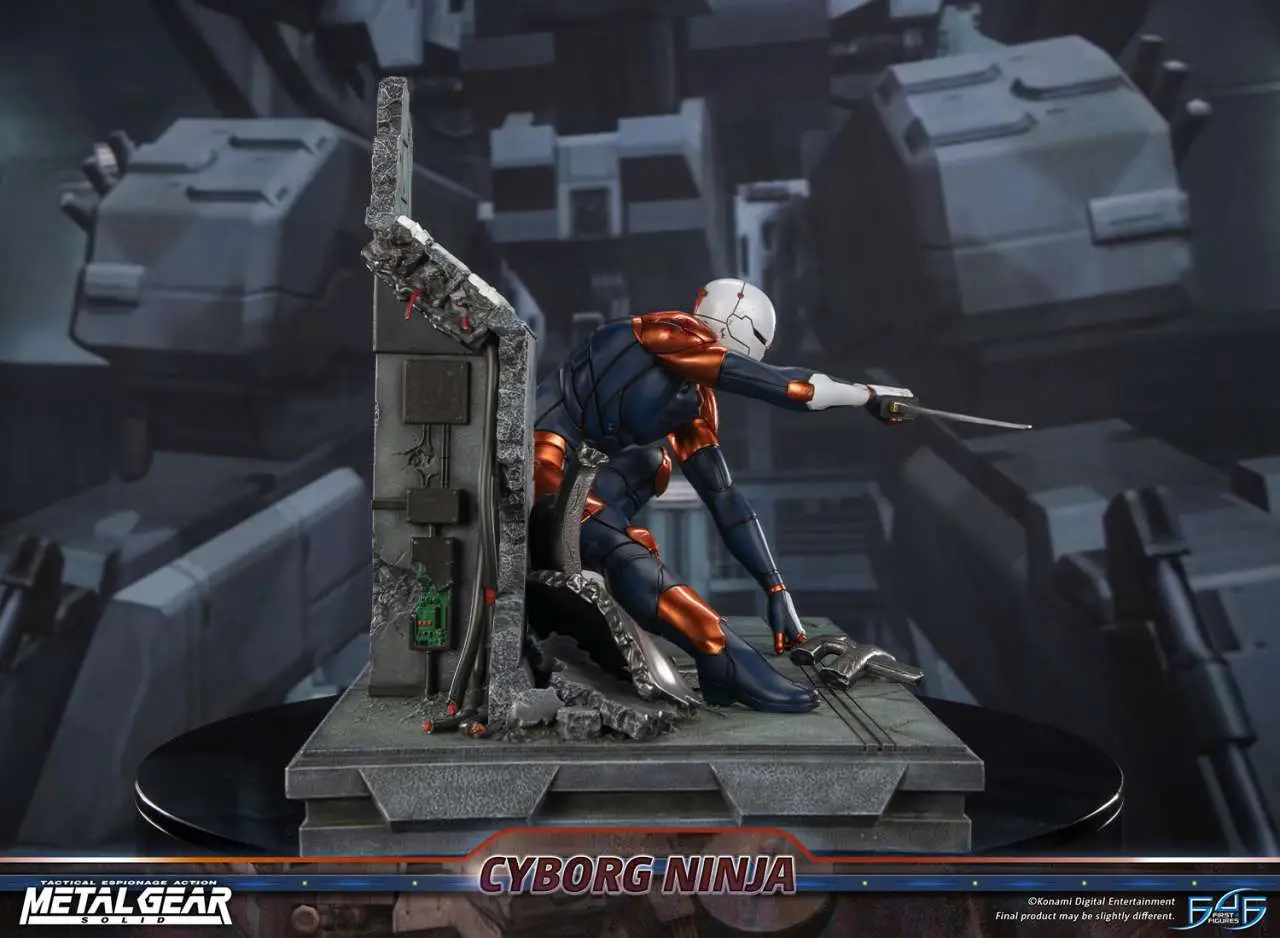 The statue is inspired by the intense boss battle where Cyborg Ninja and Solid Snake face off against Liquid Snake, who is piloting the Metal Gear REX. It depicts Cyborg Ninja in a dynamic, ninja-like pose, wielding his high-frequency blade in his right hand. The statue faithfully captures his appearance, showcasing the blue, brown, and white Cyborg Ninja Exoskeleton, with the distinctive red lamp in the center of his face mask flanked by eyeholes on both sides. The base design meticulously recreates the scene of the boss battle set in the underground base of Shadow Moses.