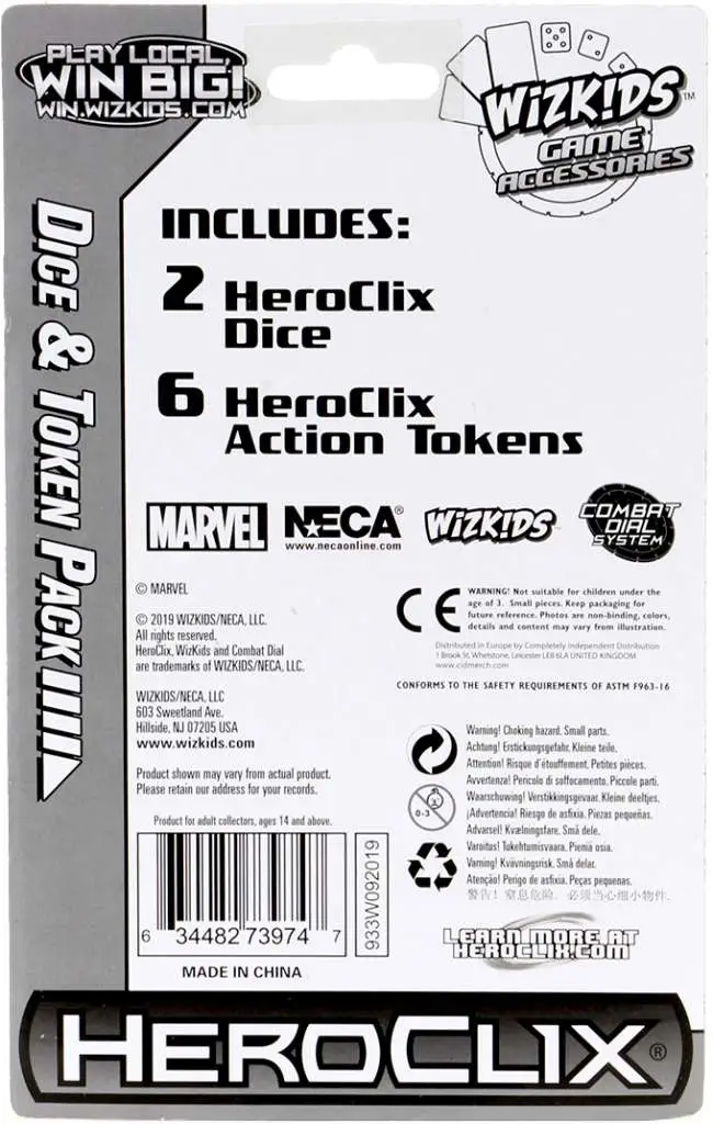 The Marvel HeroClix: Captain America and the Avengers Dice and Token Pack contains 2 custom dice featuring a special Avengers/Captain America icon to celebrate the release of the Marvel HeroClix: Captain America and the Avengers Booster Brick! The 6 action tokens will also feature bystanders on the back to use with characters that generate bystanders in the Booster Set!
