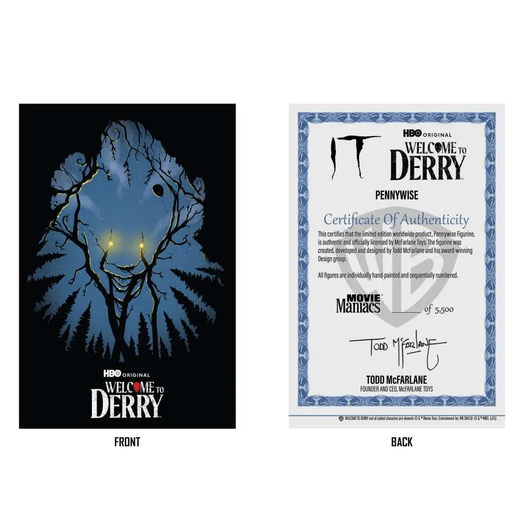 Based on Stephen King's novel IT, the new horror-drama series IT: Welcome to Derry expands the vision established by filmmaker Andy Muschietti in the feature films IT and IT Chapter Two. PENNYWISE is based on the upcoming series IT: Welcome to Derry. Incredibly detailed, highly decorated 6" scale figure. Includes scenic printed back drop and environmental base display. Includes art card with numbered certificate of authenticity and card holder. Also includes secret bonus item. Collect all McFarlane Toys Movie Maniacs figures.