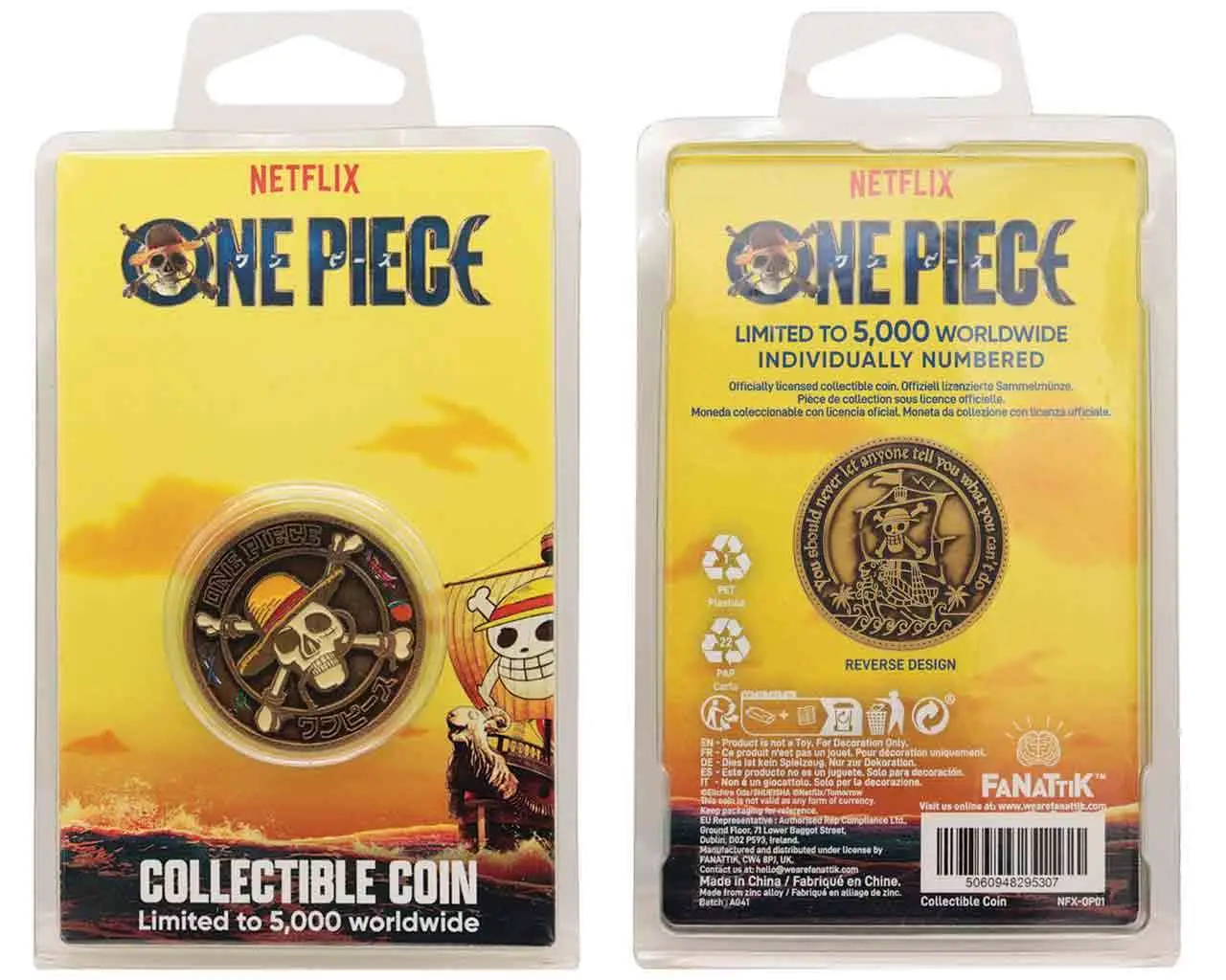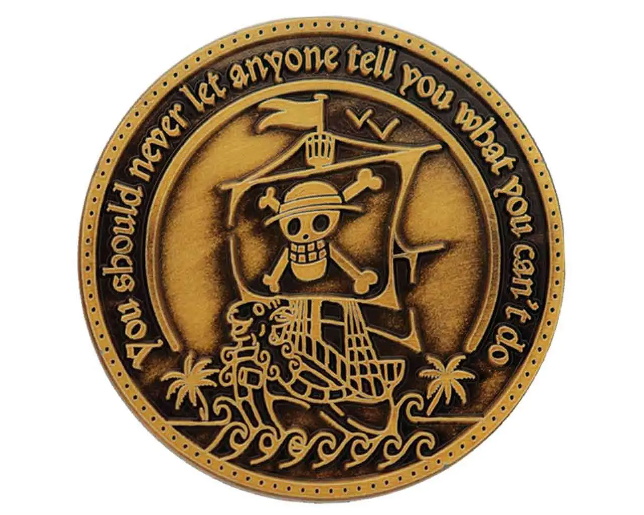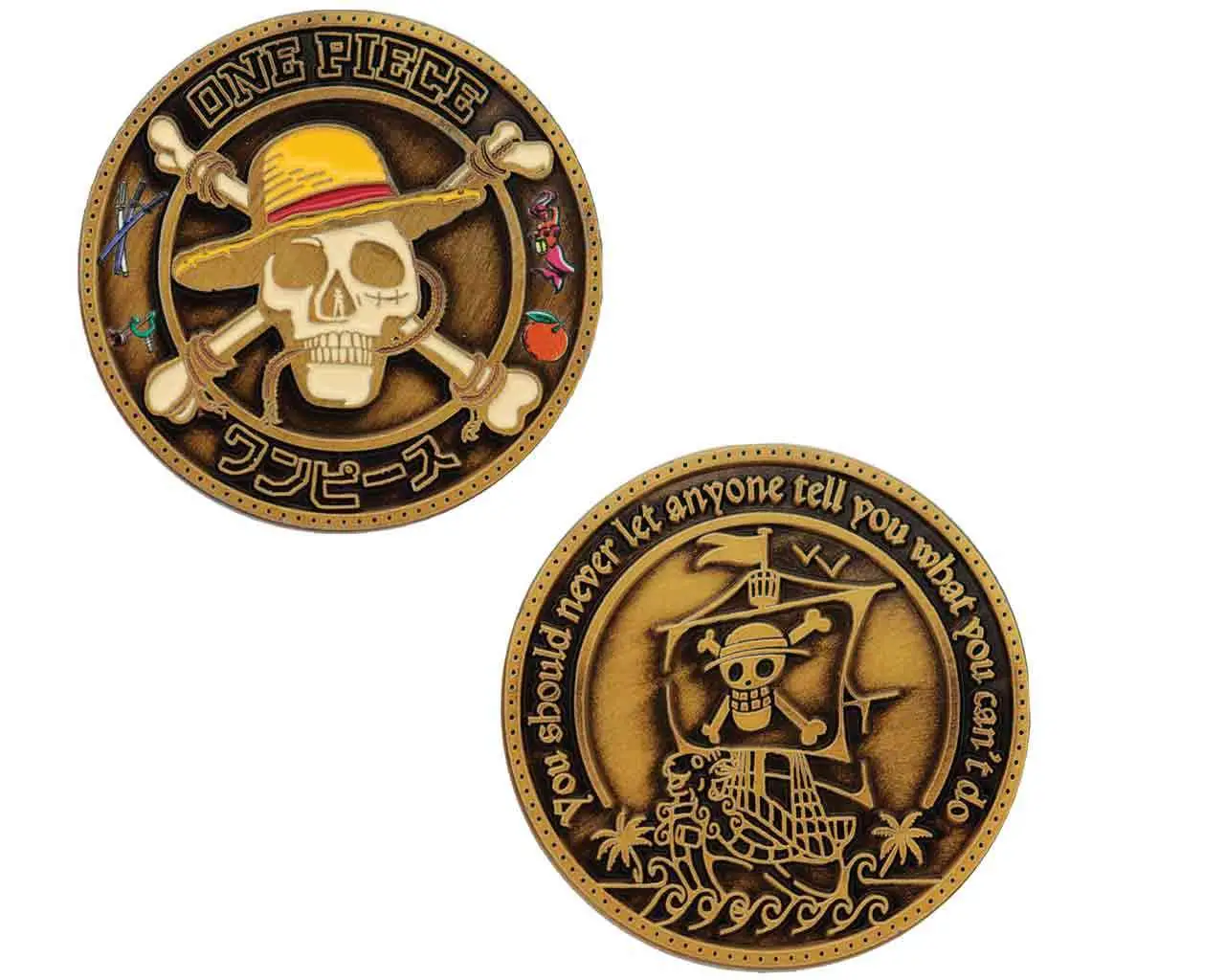 "You should never let anyone tell you what you can't do" are Luffy's wise words to Koby, and they are also embossed on the reverse of this limited edition collectible coin. The words surround the Going Merry, Luffy's first ship, and the front features the One Piece Jolly Roger. Each of these officially licensed coins are limited to 5,000 worldwide, individually numbered, and come in display packaging.