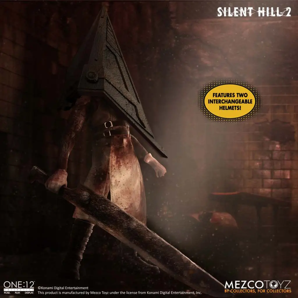 The One:12 Collective Red Pyramid Thing is outfitted in a weathered smock as seen in Silent Hill 2, and two interchangeable helmets.