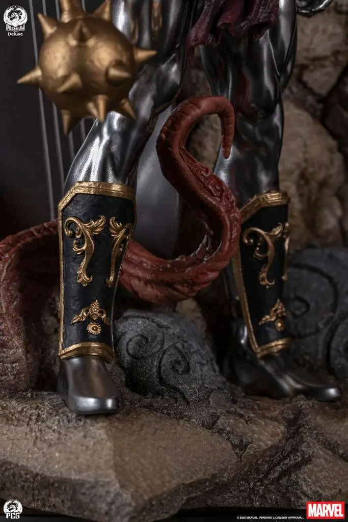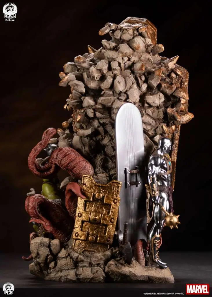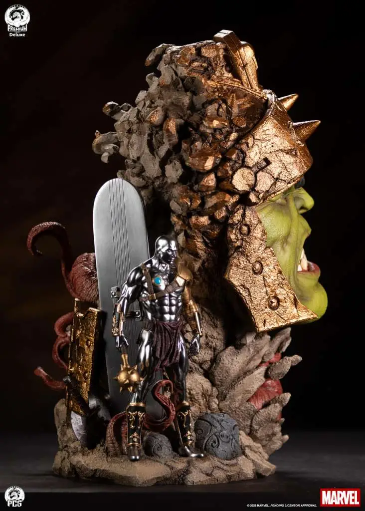 Standing 22” high, this exceptionally unique collectible centers on an appropriately angry portrait of the displaced hero which transitions gradually into a rocky surface reminiscent of the harsh surface of the battleworld, Sakaar. Surrounding the portrait is a scene of the heavily armored Hulk battling a vicious “Devil Corker”, a gorgeously detailed and fully armored Savage Surfer as well as a selection of weapons and armor used in their iconic gladiator match.