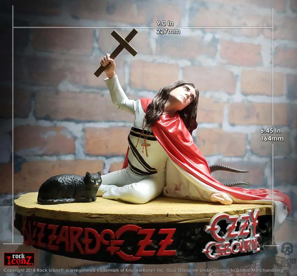 All Rock Iconz statues are hand-crafted. This is a fine-arts process where each statue is hand-cast, painted and numbered. The Ozzy Osbourne Rock Iconz statue is officially licensed.  There are only 3000 created and sold worldwide. These statues are created in 1/9 scale, making the average height of each approximately 8.5” tall and each statue comes with a certificate of authenticity on the base of the statue. Ozzy’s Rock Iconz design is 6.45 inches tall and 9 inches wide.