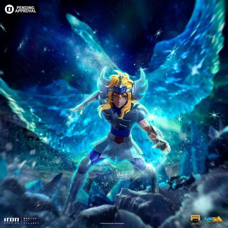 Iron Studios also bring the Deluxe version of the statue "Cygnus Hyōga - Saint Seiya - Deluxe Art Scale 1/10", with a base with his rear protected by a wall of sharp frozen stalagmites, from which a sculpture of a great ice swan representing his avatar rises, with LED lights.