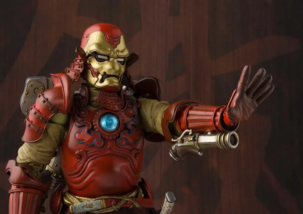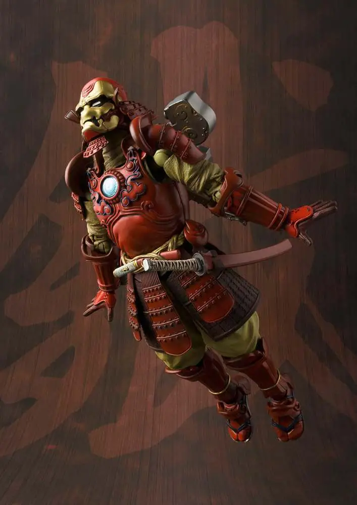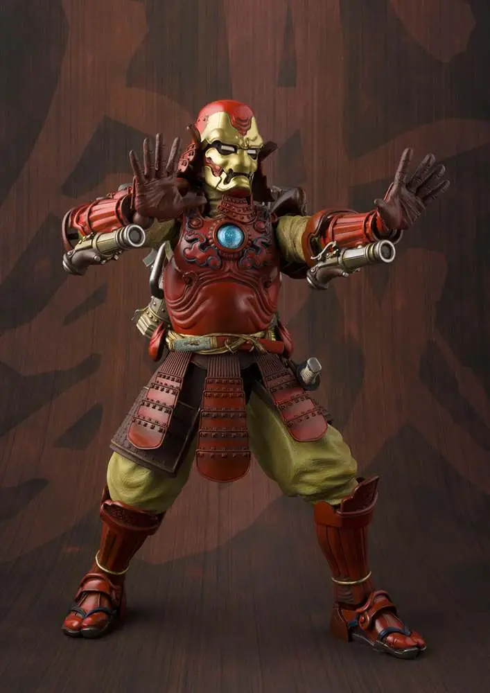 The popular Meisho MANGA REALIZATION series re-envisions hit characters as samurai of old. The second release is Iron Man Mark 3, as envisioned by the talented Takayuki Takeya. Iron Man’s high-tech armor is rendered as ancient samurai armor, with details down to the ornate scroll-work on the breastplate and rivets on the plating. Clockwork, steam-punk style jetpack and flintlock rifle-esque cannons enhance the fantastic atmosphere of the design. The 180mm figure comes with two types of optional hands (left and right sides), a katana, and a jetpack.