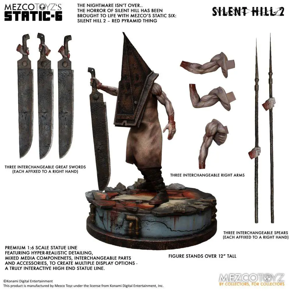 The Mezco’s Static Six: Silent Hill 2 – Red Pyramid Thing statue is based on the nightmare-inducing Silent Hill 2. The gruesome headsman wears weathered work pants and stands menacingly atop a decaying Brookhaven Hospital. Red Pyramid Thing is ready to strike with his Great Sword or Great Spear, which he holds with his interchangeable right hand and can be swapped onto his interchangable right arm for a multitude of different poses.