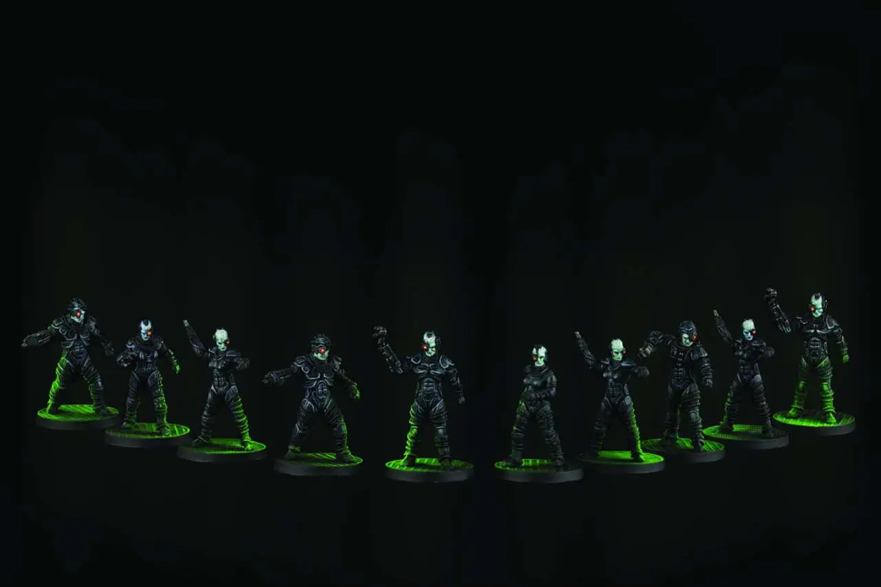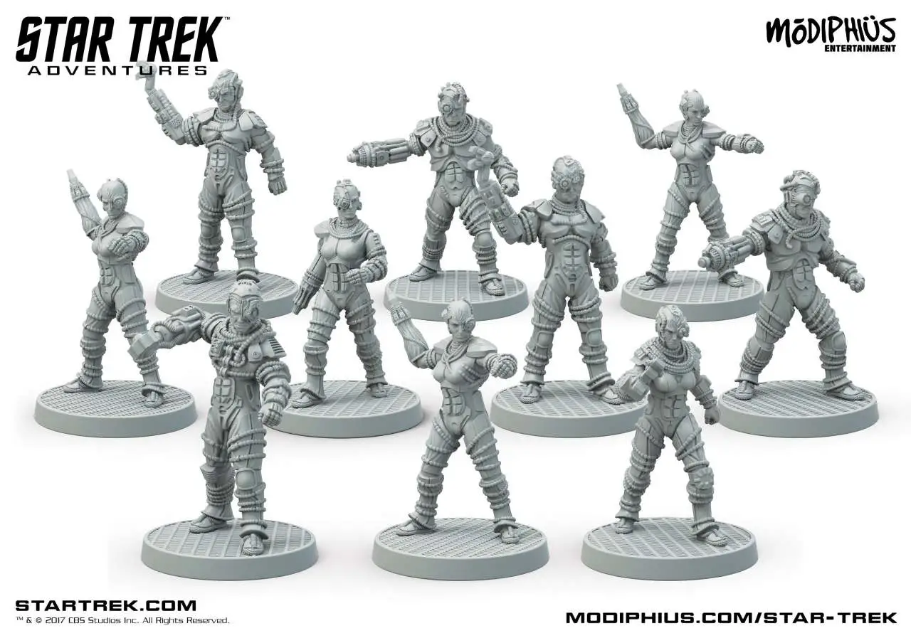 This box set of 10 highly detailed, 32mm scale, resin miniatures of Borg drones contains 5 male and 5 female Borg drones, with 30mm scenic bases incorporated into each figure.