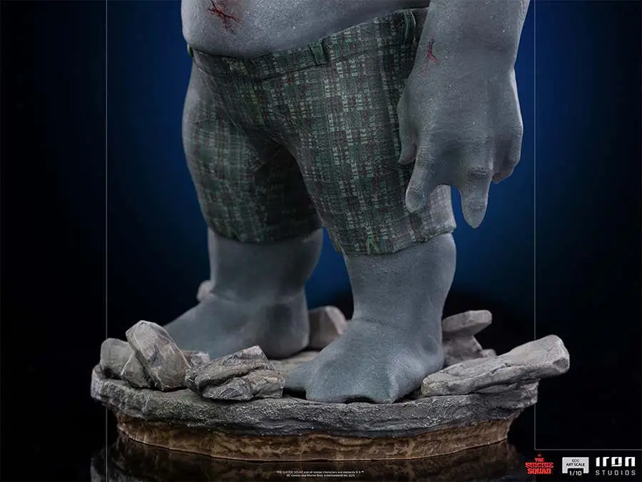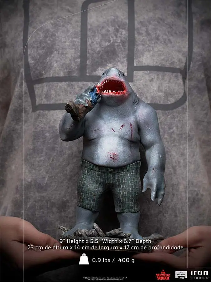 The corpulent creature, wearing only a pair of shorts, opens its deadly mouth, showing dozens of sharp triangular teeth, to enjoy a peculiar and bizarre snack. Ignoring the wounds and scars spread across his thick blue-gray skin, apparently relaxed, he is always ready and willing to satiate his constant and ravenous appetite. Represented in the statue "King Shark BDS Art Scale 1/10 - The Suicide Squad - Iron Studios", we present the most feared (and sometimes comical) ocean predator in the DC universe and member of the Suicide Squad.