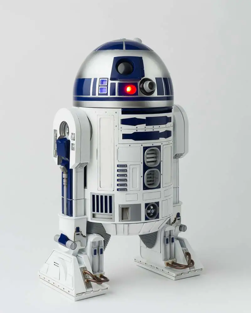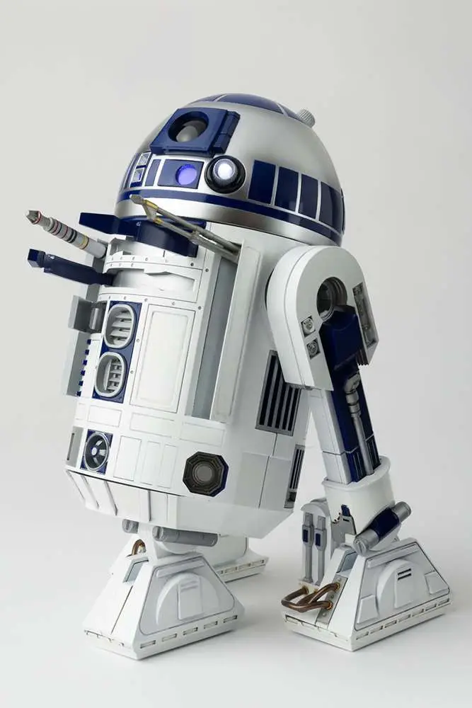 A dream collaboration between Star Wars and CHOGOKIN. This accurately detailed diecast figure of the famed astromech droid R2-D2 stands 176mm tall and weighs a whopping kilogram! The hatches open to reveal manipulator arms, it can transform between bipedal and tripedal modes, and eight LEDs illuminate to capture R2-D2's trademark expressions. The plastic and diecast figure includes a cover for use when in bipedal mode, a stand, and a droid control bolt.