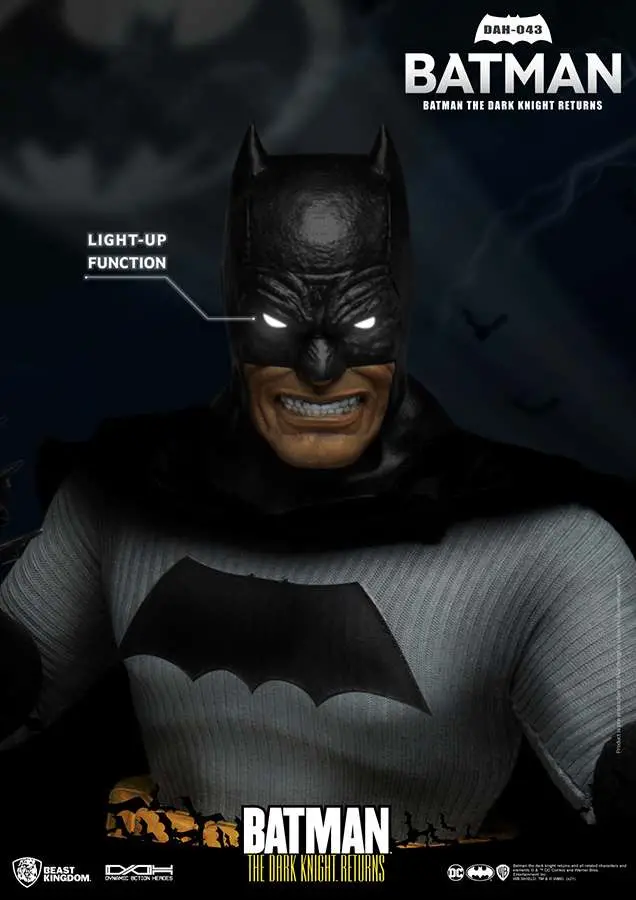 Beast Kingdom’s The Dark Knight Returns DAH figure brings to life a classic rendition of an old but still powerful Batman fighting to save the soul of his city, Gotham. Standing at roughly 20.5cm in height, the overpowering, strong physic of the ageing Batman is accentuated with a form fitting suit made of real fabric. The details, from the Bat logo down to the utility belt are faithfully restored. Using real cloth for the cloak also gives collectors ample ways for posing, in addition to the bevy of replaceable mouth and eye pieces, as well as a light up eye function, allowing Batman to show a wide range of emotions. The included grappling gun and multiple replacement hands, as well as a dedicated base tops of this must have set.