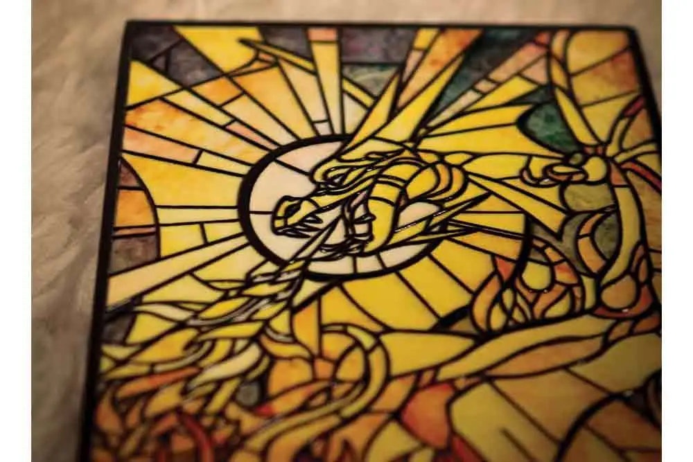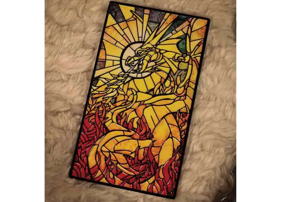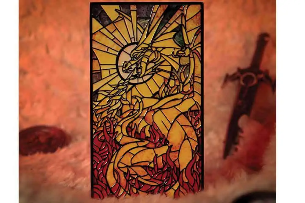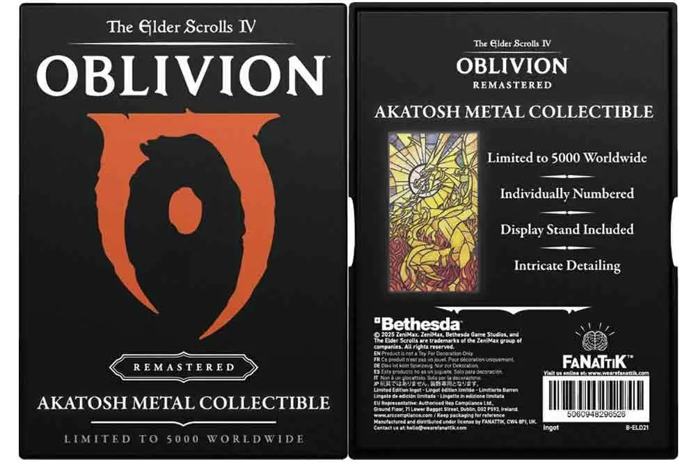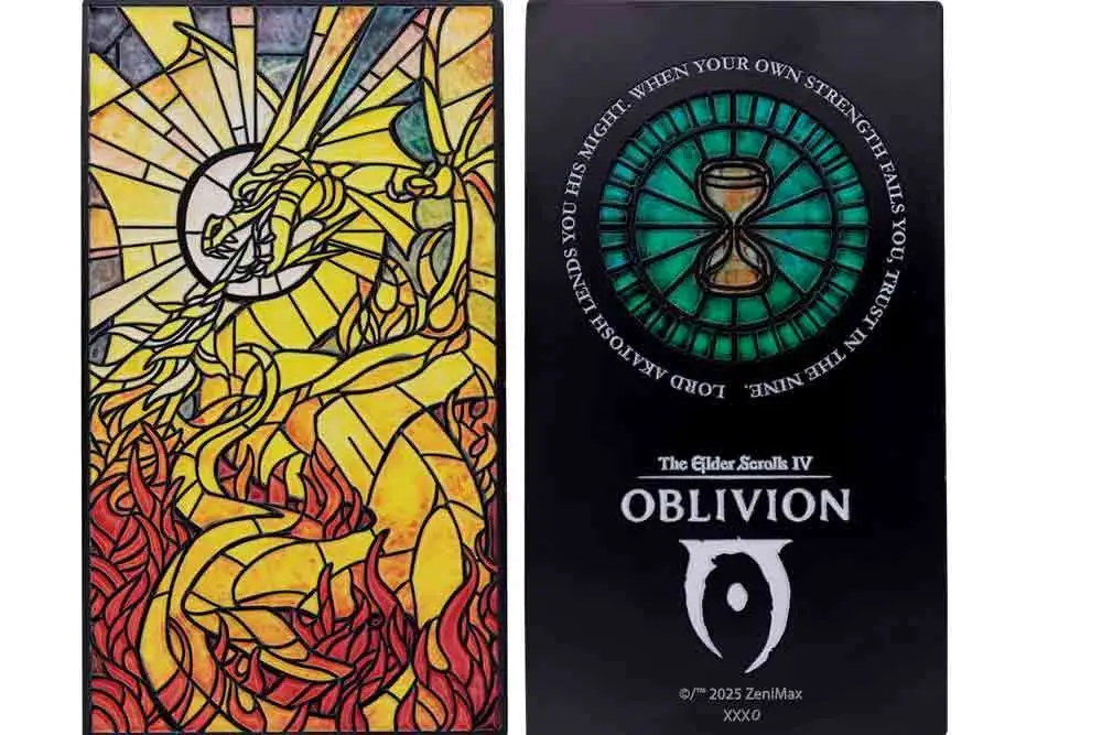The head deity of the Divines, Akatosh is the Dragon God of Time and is mentioned in every Elder Scrolls game, including The Elder Scrolls IV: Oblivion, and is depicted on this ingot in the style of a stained glass window. It measures 100 x 56.8mm, is finished in black nickel with coloured details, and comes with a display stand inside its presentation box.