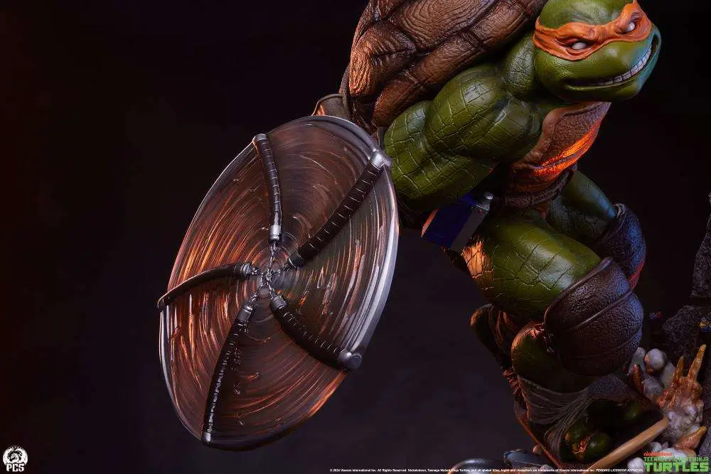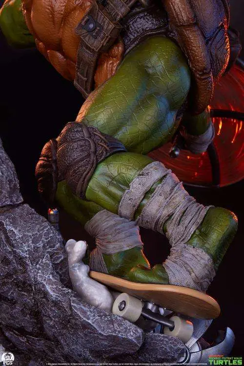The Michelangelo statue is carefully crafted to showcase a stylized mixture between his more realistic and comic styled depictions. With detailed paint work and design, you can see each scale on his body, every cut of his shell, and his battle-hardened physique from his many clashes with the TMNT rogues' gallery alongside his brothers Leonardo, Raphael, and Donatello.
