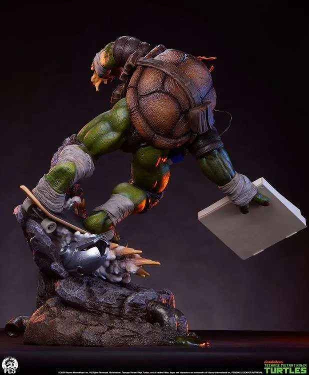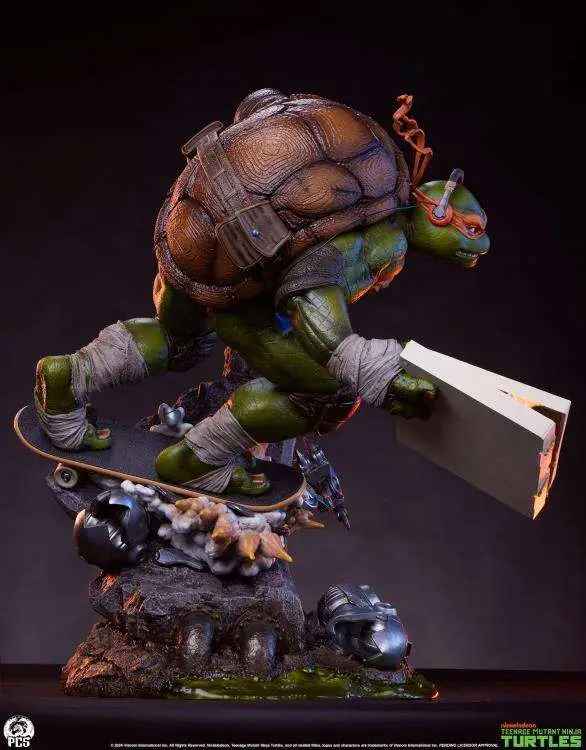 The Michelangelo 1:3 scale statue measures 26.5” tall and nearly 19” wide as this fun-loving turtle whirls his nunchucks while carving through the NYC sewer system on his skateboard.