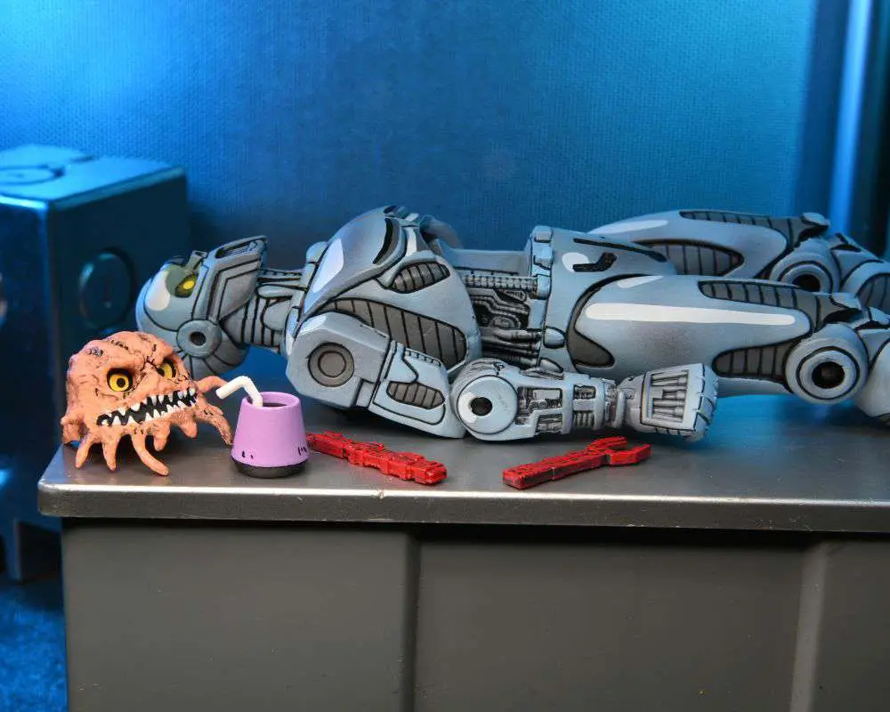 Based on the original Eastman & Laird Teenage Mutant Ninja Turtles comic books from Mirage Studios! These robot exoskeletons look fierce, but the Utroms are peaceful aliens who crashed on Earth and have been hiding behind their shell corporation, T.C.R.I. This 7” scale exoskeleton has a removable Utrom and includes interchangeable heads and hands, blaster, tools, and… is that a sippy cup? Hey, even tentacled aliens have to stay hydrated. Comes in all new special comic-book themed window box packaging illustrated by Kevin Eastman.