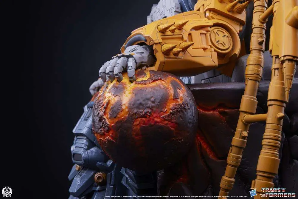 The base for this Museum Scale statue is a jagged rocky throne, an interesting visual contrast to the steely mechanical appearance of Unicron. This titanic Transformer’s incredible power is on display as he effortlessly crushes the two planets in his hands, spilling their molten cores onto his makeshift throne.