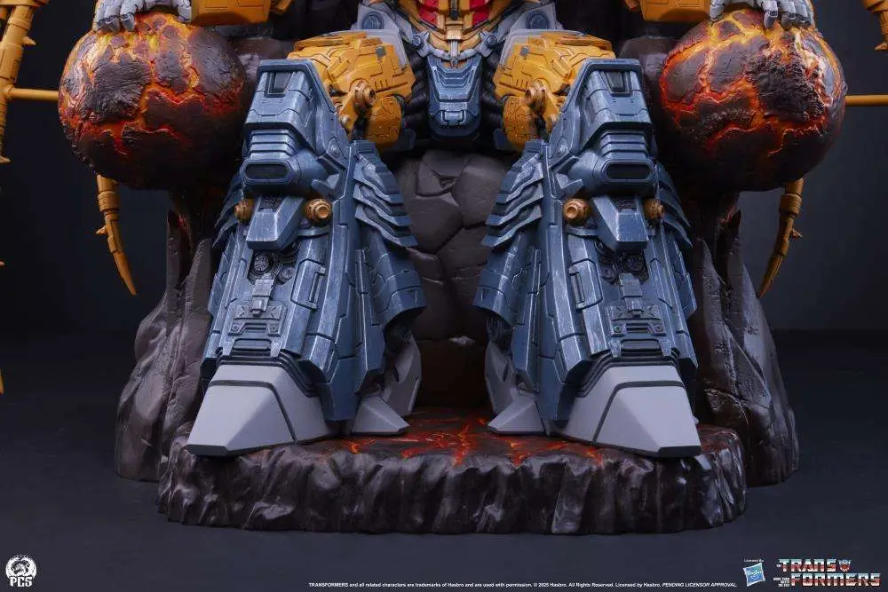 Unicron cuts an imposing figure measuring 24" tall sitting atop a throne that looks to have been carved into the side of an enormous asteroid. His 43.5” wingspan expands beyond his rough hewn throne only adding to his imposing presence. Every inch of this titanic Transformer is covered in intricate detailing such that the interlocking plates, rivets and alien technology appear ready to shift and change form into the robotic planet called Unicron.