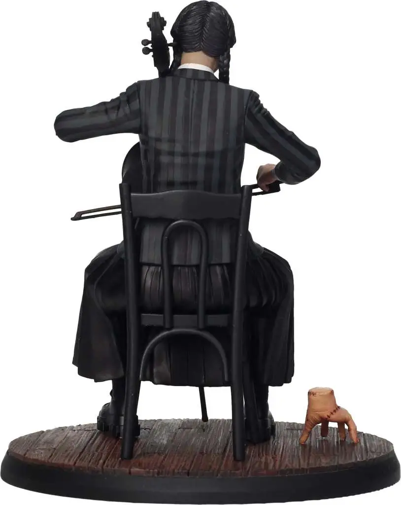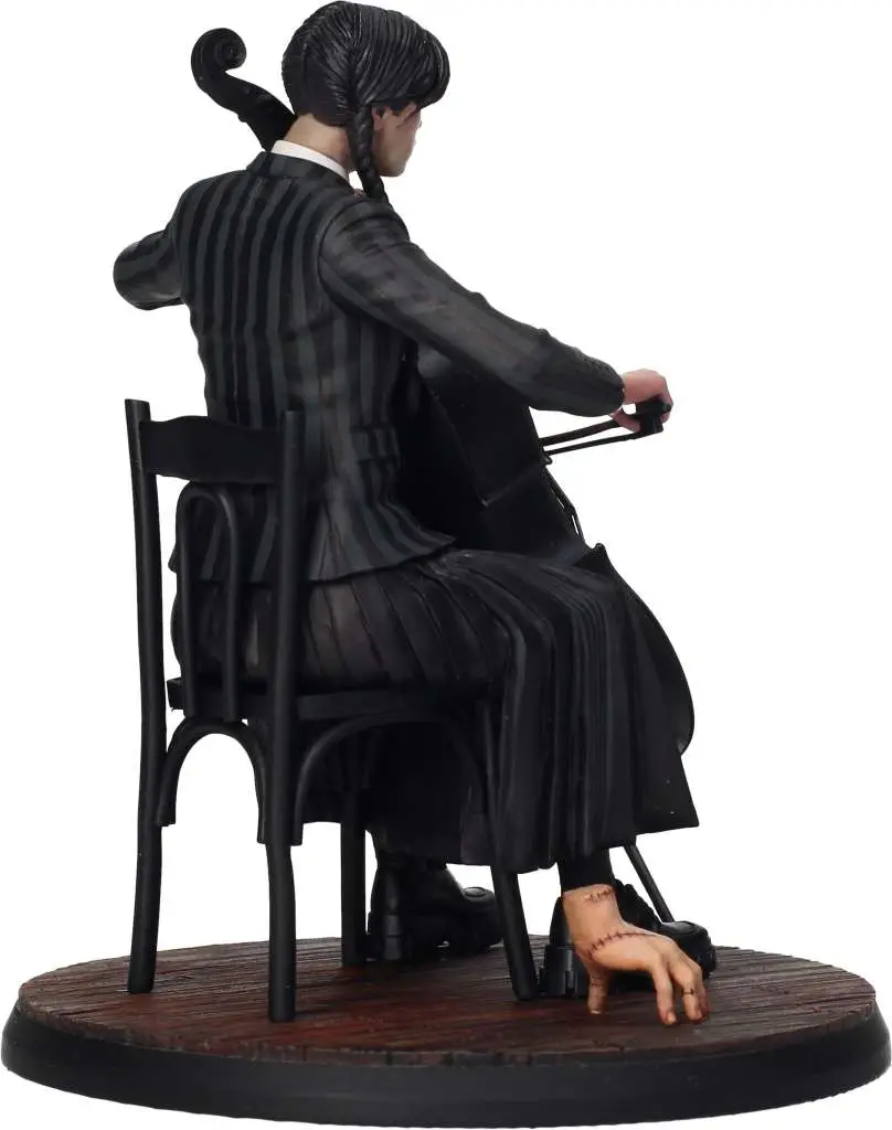 Let yourself be enchanted by the Wednesday Addams figure inspired by the Tim Burton series and magnificently interpreted by Jenna Ortega! This figure captures a magical scene where Wednesday masterfully performs the song “Paint it Black” by the Rolling Stones with her cello from her balcony, enveloped in the mysterious atmosphere where we observe all the events that surround her. Dressed in her signature ensemble of black shoes, long skirt, dark gray striped jacket, black knit vest, white shirt and black tie, Wednesday's distinctive hairstyle, with her distinctive bangs and two long braids, along with black painted nails , add your unique charm. And, of course, she's accompanied by the Addams Family's guardian, Thing, with her intricate stitching at her side. This figure is a must have for any true fan!