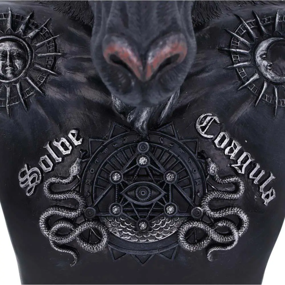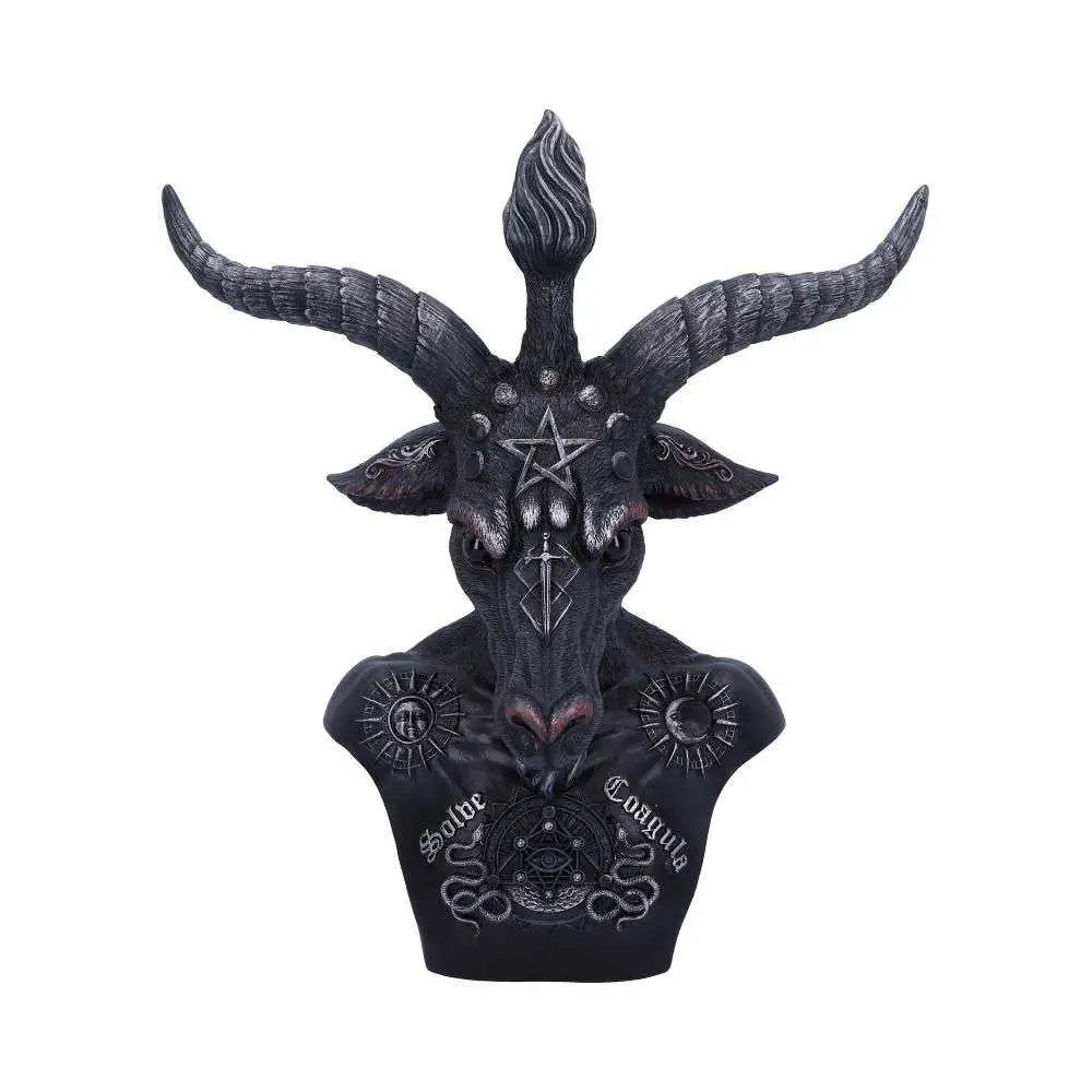 Baphomet represents the symbolisastion of the equilibrium of opposites, of free-thinking heresy and forbidden knowledge. In this bust he has a torch between its horns and a pentagram on its forehead, representing the science and the mysticism. Its chest bares the Latin words SOLVE (separate) and COAGULA (join together), on its chest are two snakes representing Male and Female, on its shoulders are the Sun and the Moon, the powers of binding and loosing, embodying opposites and celebrating contrasts.