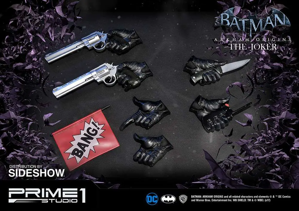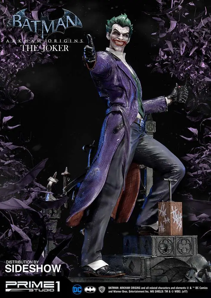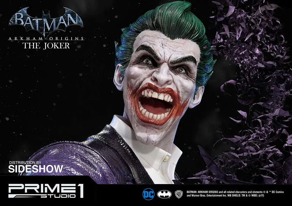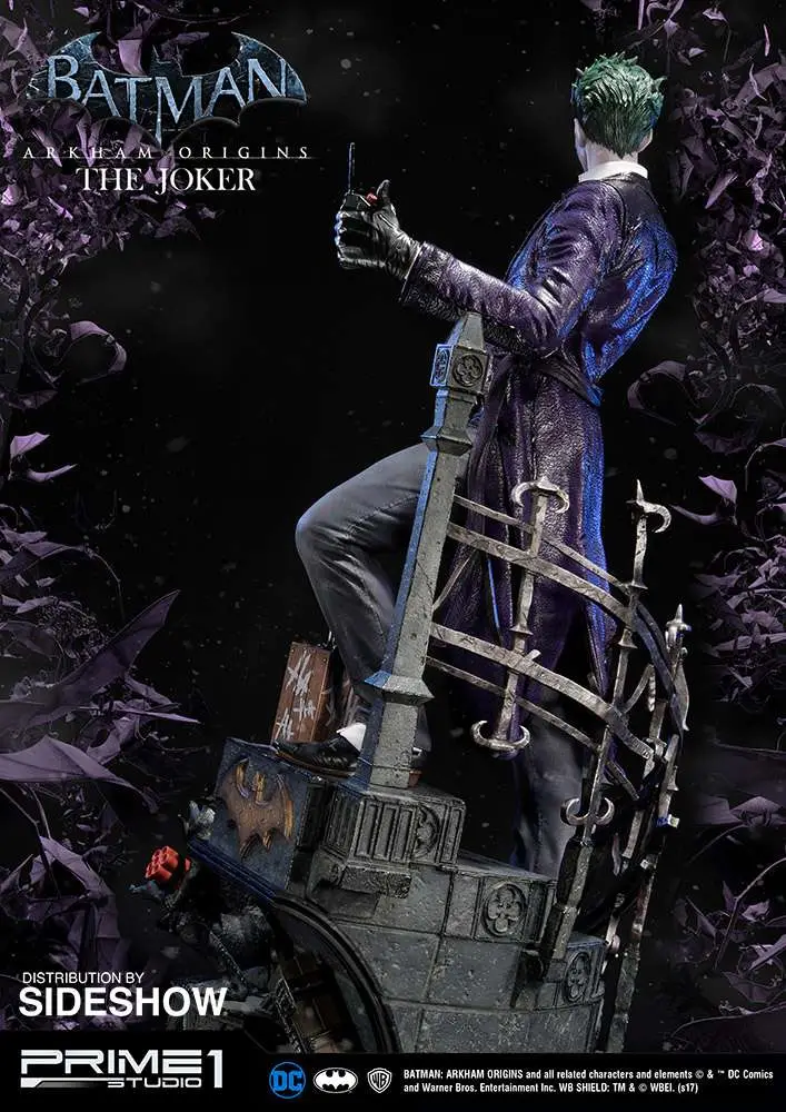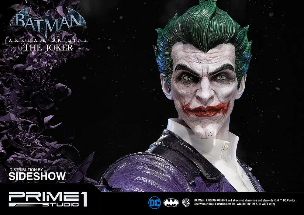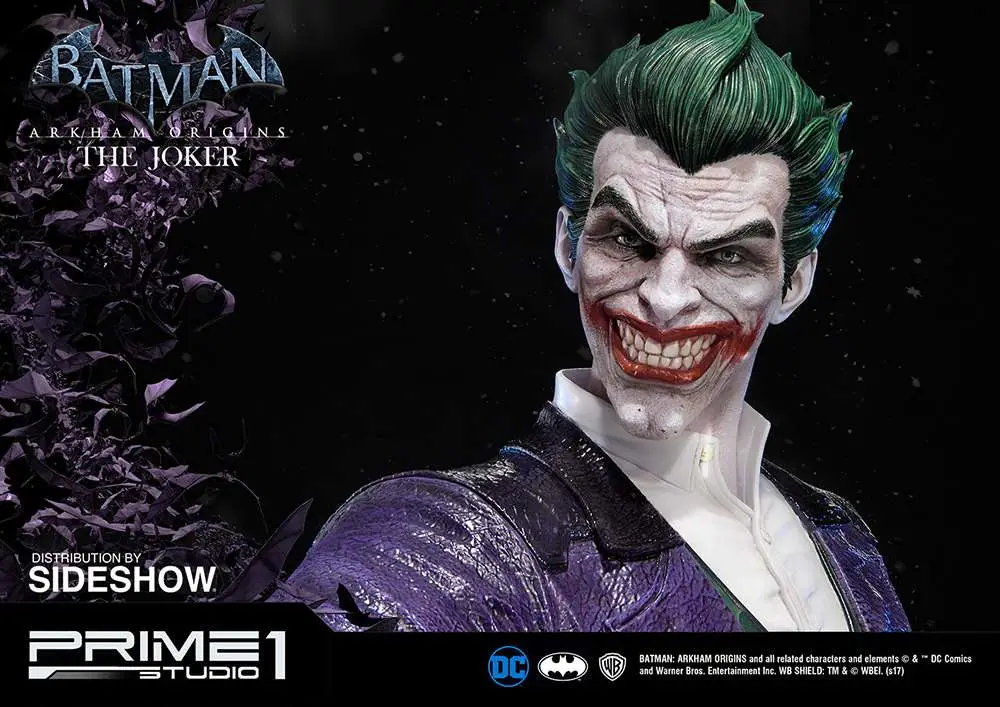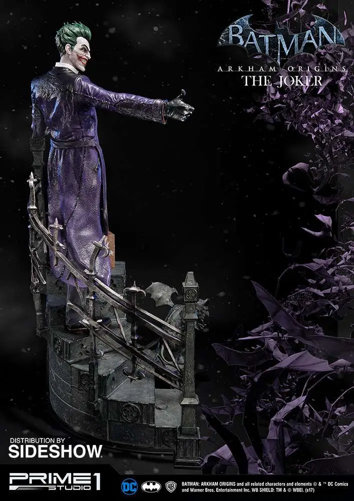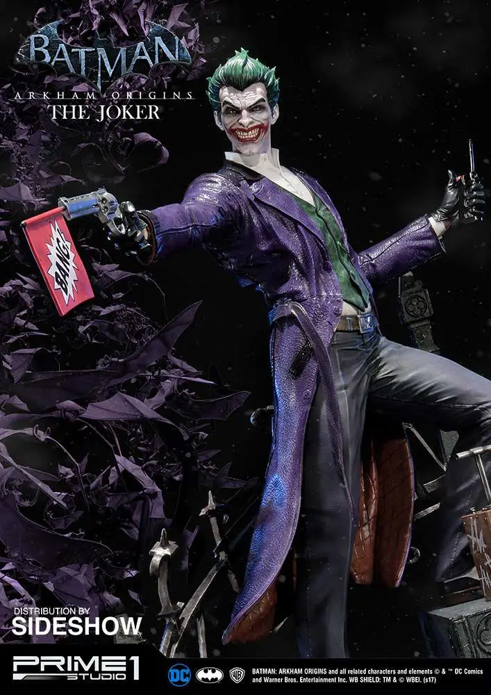 Sideshow et Prime 1 Studio sont fiers de vous présenter Le Joker tiré de Batman: Arkham Origins. Le Joker est un supervilain fou furieux et sociopathe et la Nemesis de Batman. sa peau blanche, ses cheveux verts et ses lèvres rouge sang démentent sa nature chaotique cachée sous une apparence cartoonesque. Le très intelligent "Prince Clown du Crime" n'a pas de superpouvoir au-delà de sa capacité à l'ultra-violence et à semer un chaos mortel et à fréquemment concocter des plans élaborés pour piéger son ennemi juré. Il est le principal antagoniste dans les jeux vidéo Arkham Origins et Arkham Asylum, un des principaux dans Arkham City et dans Arkham Knight, et peut être considéré comme le Méchant central de la série Arkham de manière générale.