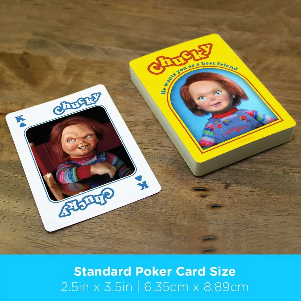 Escape death and let terror in! Bring a new playmate into the house to play your favorite card games with this officially licensed deck of playing cards featuring Chucky, the most dangerous of toys.
