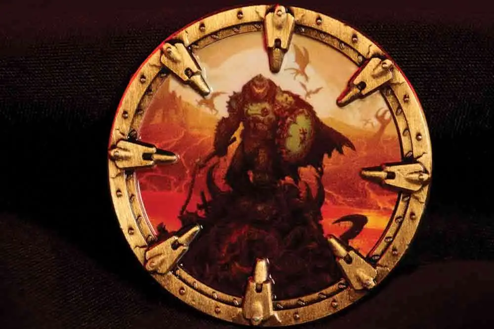 Entourée d’un bord unique en forme de bouclier, inspiré de l’édition deluxe, la face de la pièce représente le légendaire Slayer dans une illustration riche en détails.
