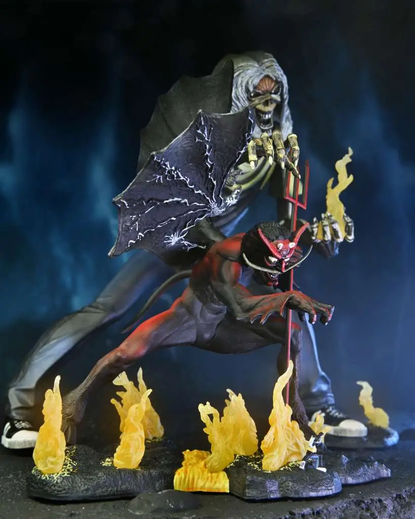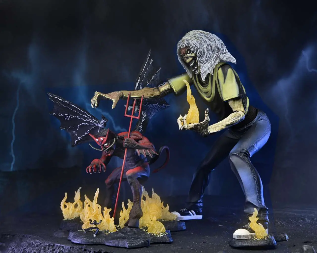 It's Eddie, Iron Maiden's legendary mascot, as he appears on The Number of the Beast album and single covers! Celebrate the 40th anniversary of this metal masterpiece with this 7" scale figure set that lets you recreate Derek Riggs' art for both the iconic 1982 album and title track single. Eddie features stunning detail in paint and sculpt that really recreates the illustrations, and is puppeteering the devil himself, who has his own even smaller Eddie puppet. The set also includes a Satan’s head accessory to recreate the cover art for “The Number of the Beast” single cover. Comes in special 40th anniversary 5-panel packaging with opening front flap.
